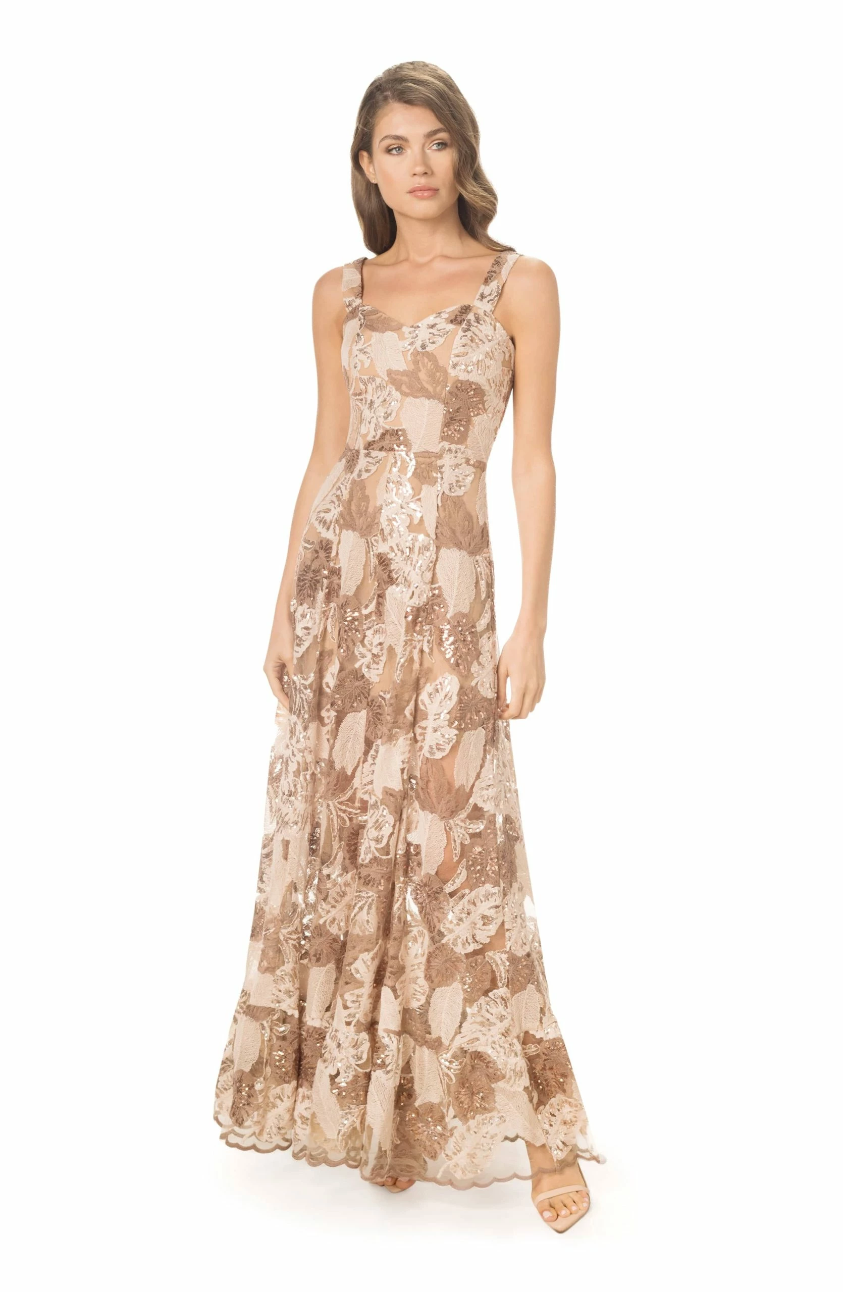 Our Anabel dress made with a foliage sequin embroidery on illusion tulle fabric. Featuring a sweetheart neckline and a fitted bustier top, this dress accentuates your curves in all the right places. The fit and flare silhouette then flows into a sweeping maxi skirt that drapes beautifully and adds a touch of drama to your look.