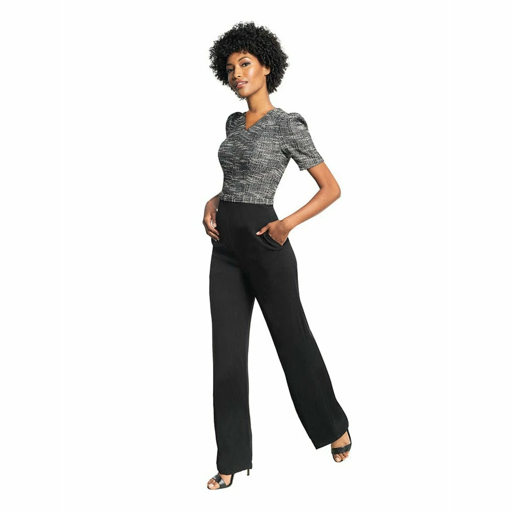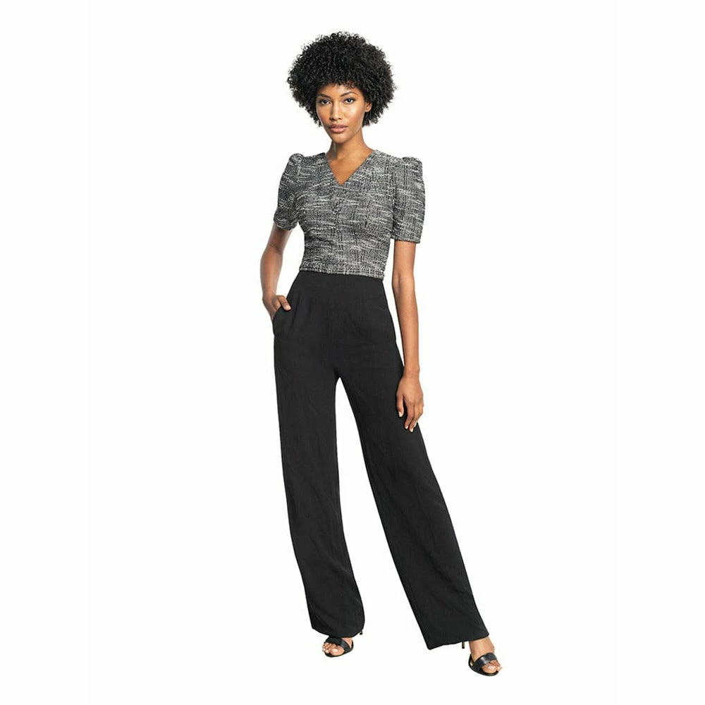 Anais takes you from day to night without a wardrobe change. This smart jumpsuit is the complete package with long, black, wide-leg trousers and a black and gray tweed top. The top features a v-neckline and puff sleeves that look polished but playful.