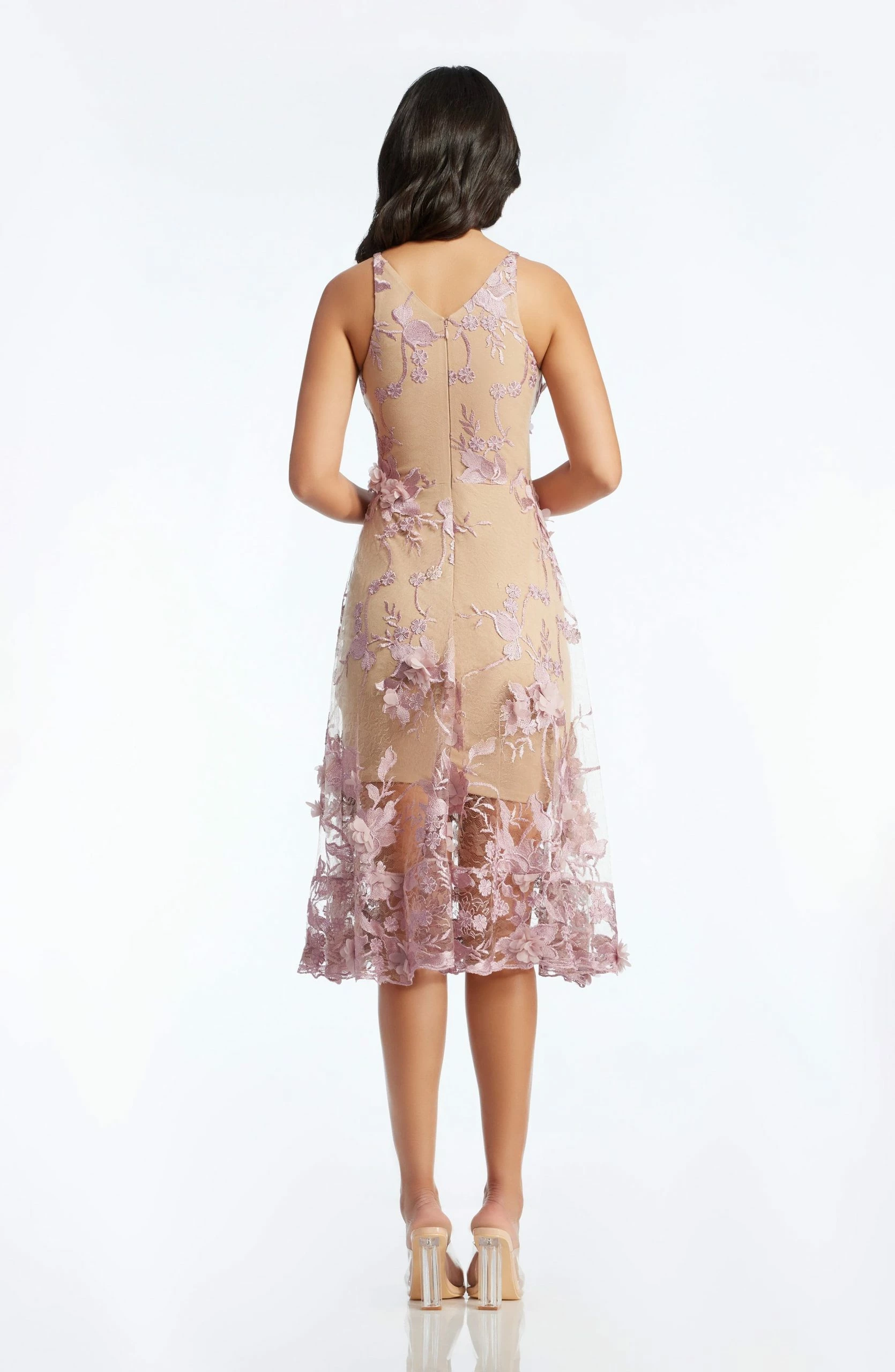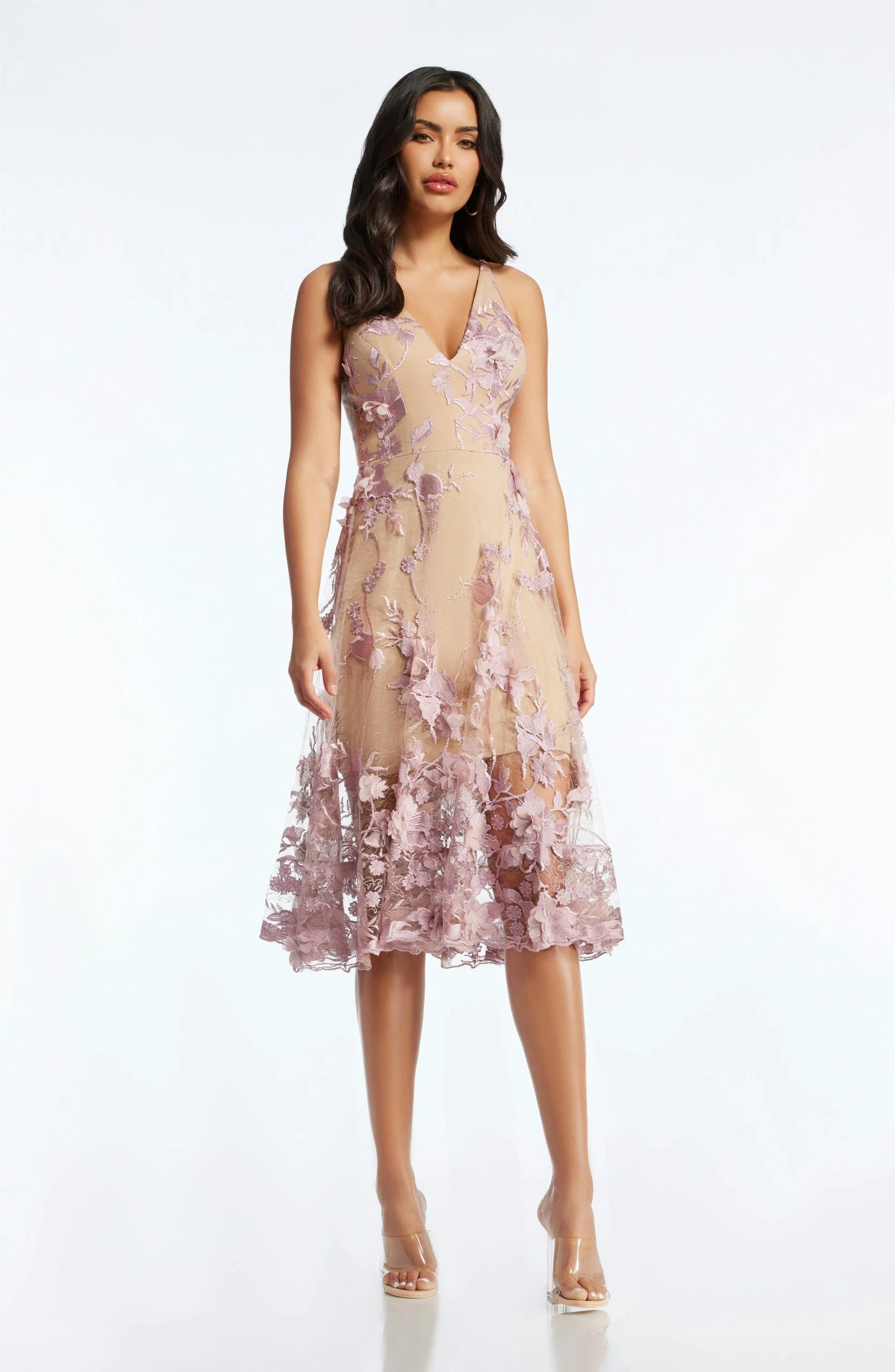 This one-of-a-kind dress features beautiful floral embellishments, creating a lush garden. With a nude sleeveless bodice and a mini skirt under a heavily adorned Liliac mesh-lace overlay, this dress is sure to impress. Audrey has a flowy midi-length A-line skirt and has a V-neck and back, highlighted by thin straps. This is the perfect option for dressy springtime events.Â