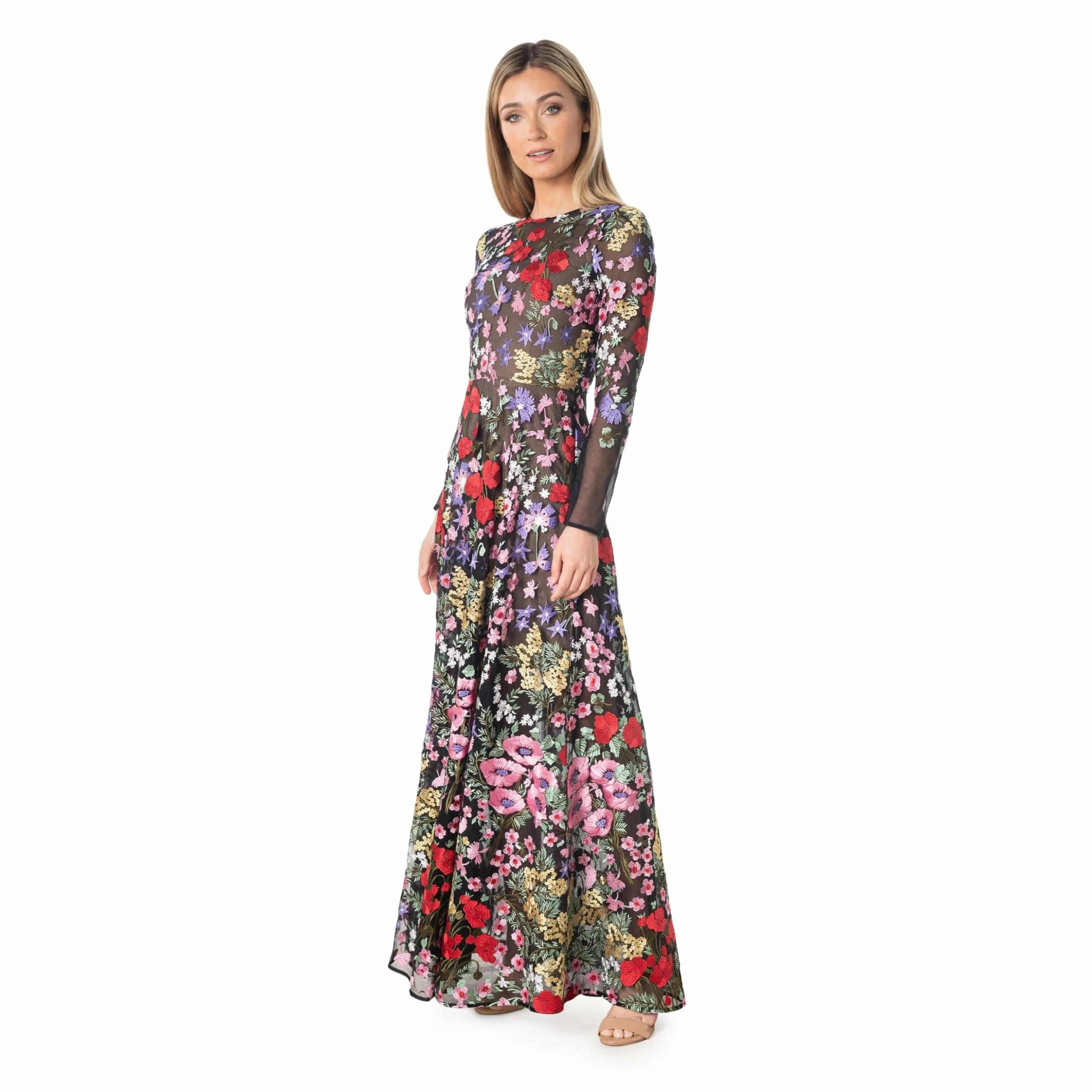 This unique floral embroidered long sleeve, illusion, fit and flare maxi dress is a show stopper. It features a key hole button back with an invisible zipper and a high neckline.