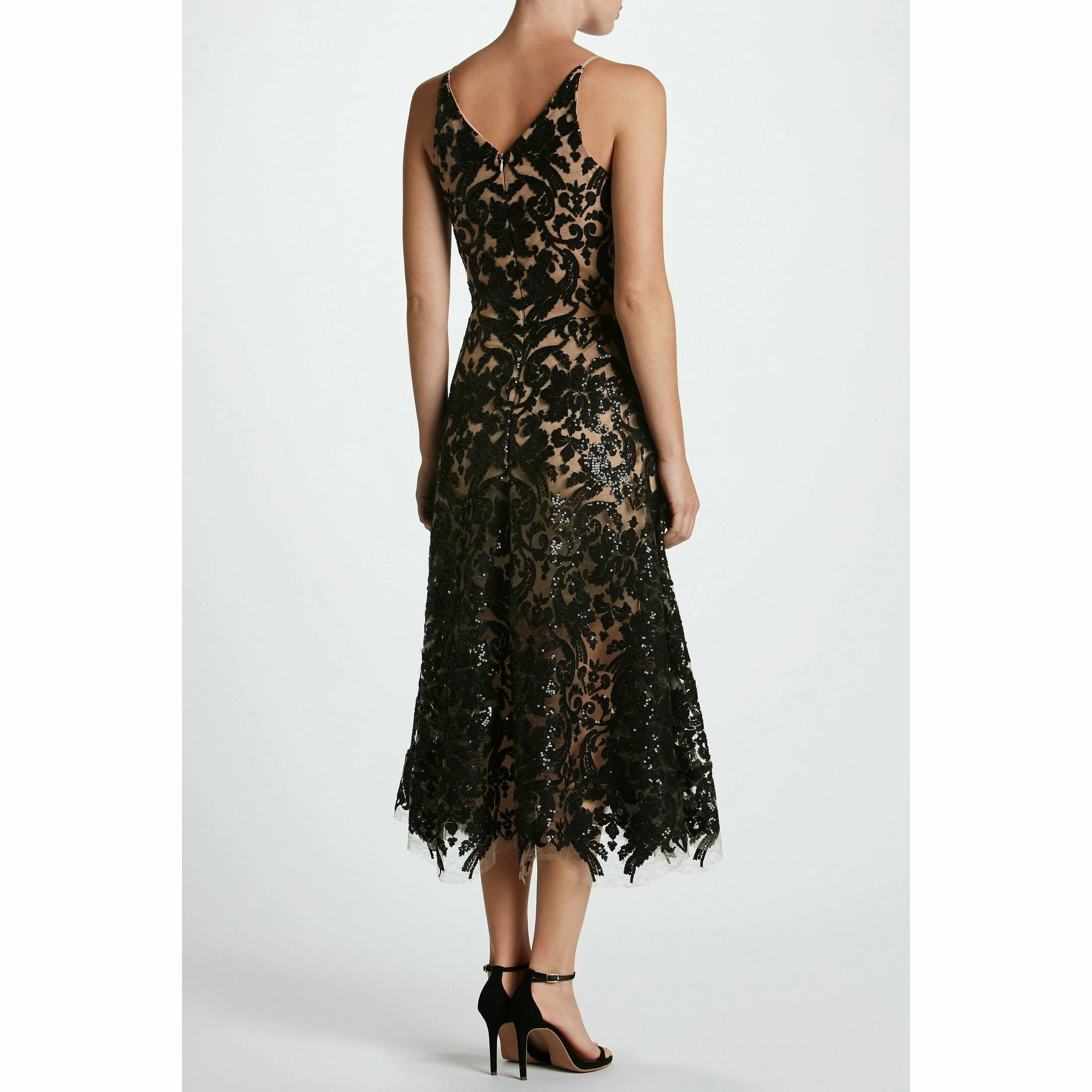 Chic and feminine. The Black floral lace overlay rests on embroidered, beige, mesh lace detailing. Tiny sequins add a subtle glimmer to the flattering classic silhouette. Delicate straps and a plunging neckline in the front are complemented by a curved v-neckline in the back, giving this sleeveless dress a flirty but sophisticated edge.