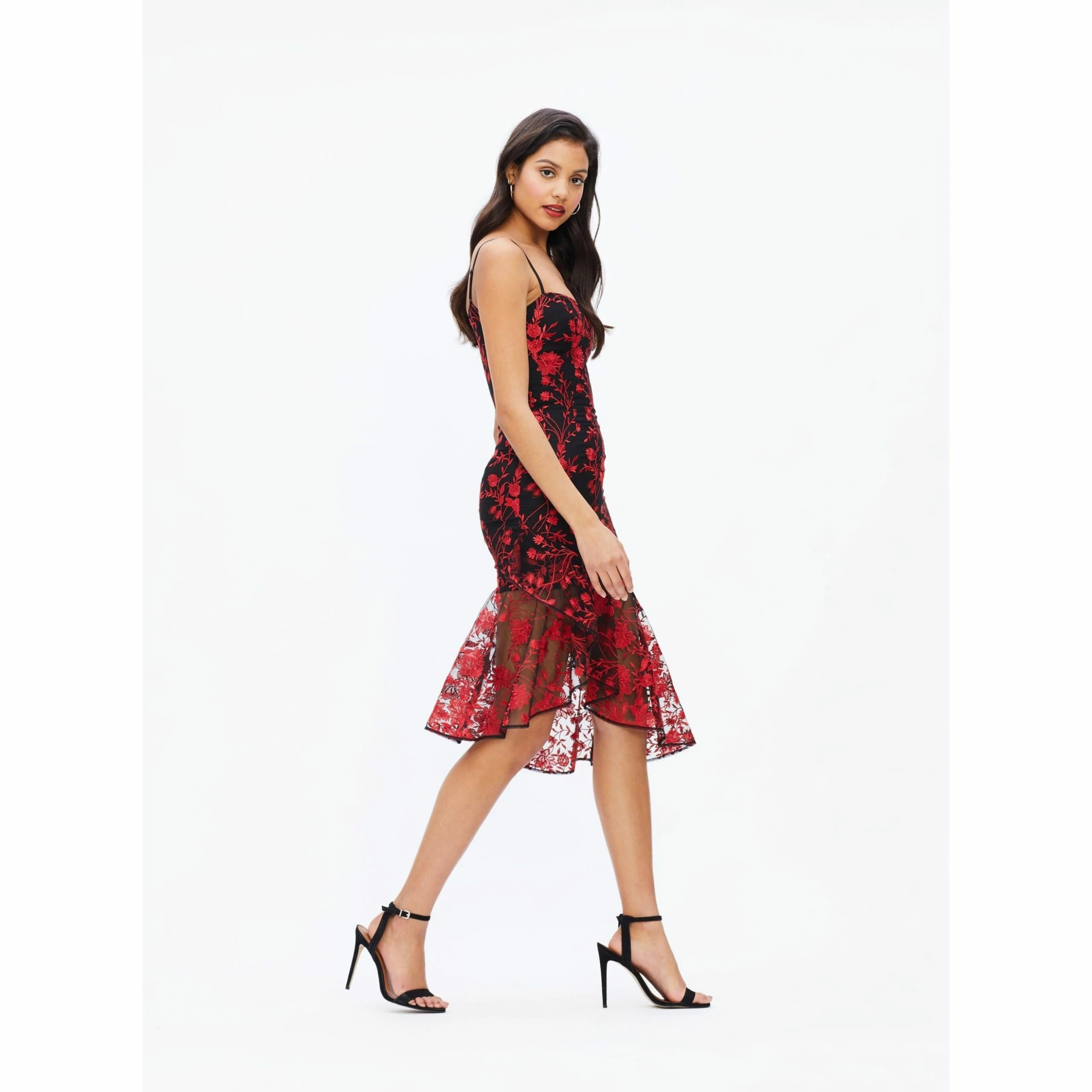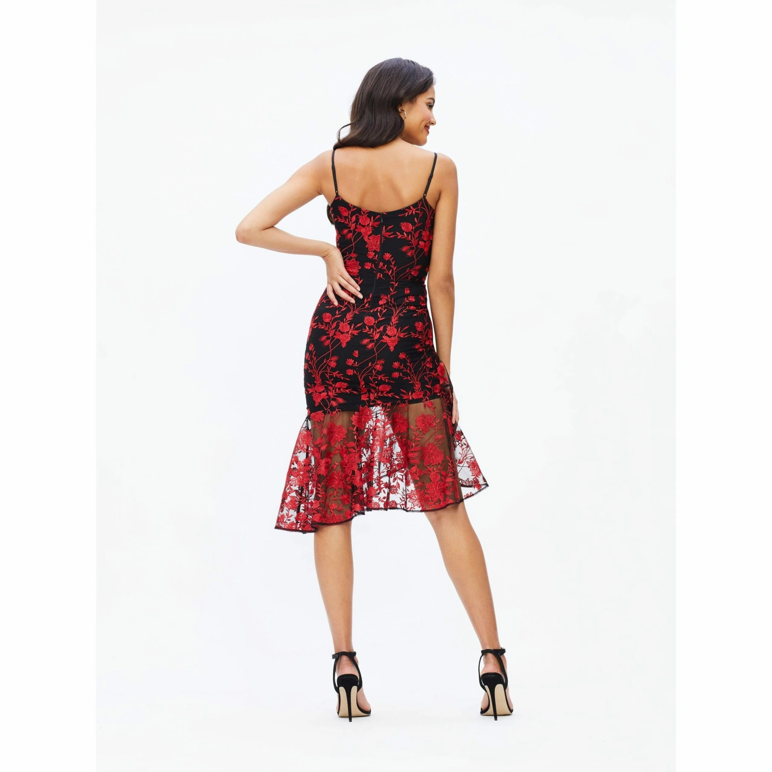 Hit the dance floor and in this fun and flirty ensemble. Cantrelle hugs your curves and its unique ruffle hem adds a bit of flair. Red floral embroidery draws the eye in and finishes off this perfect summer cocktail dress.Â