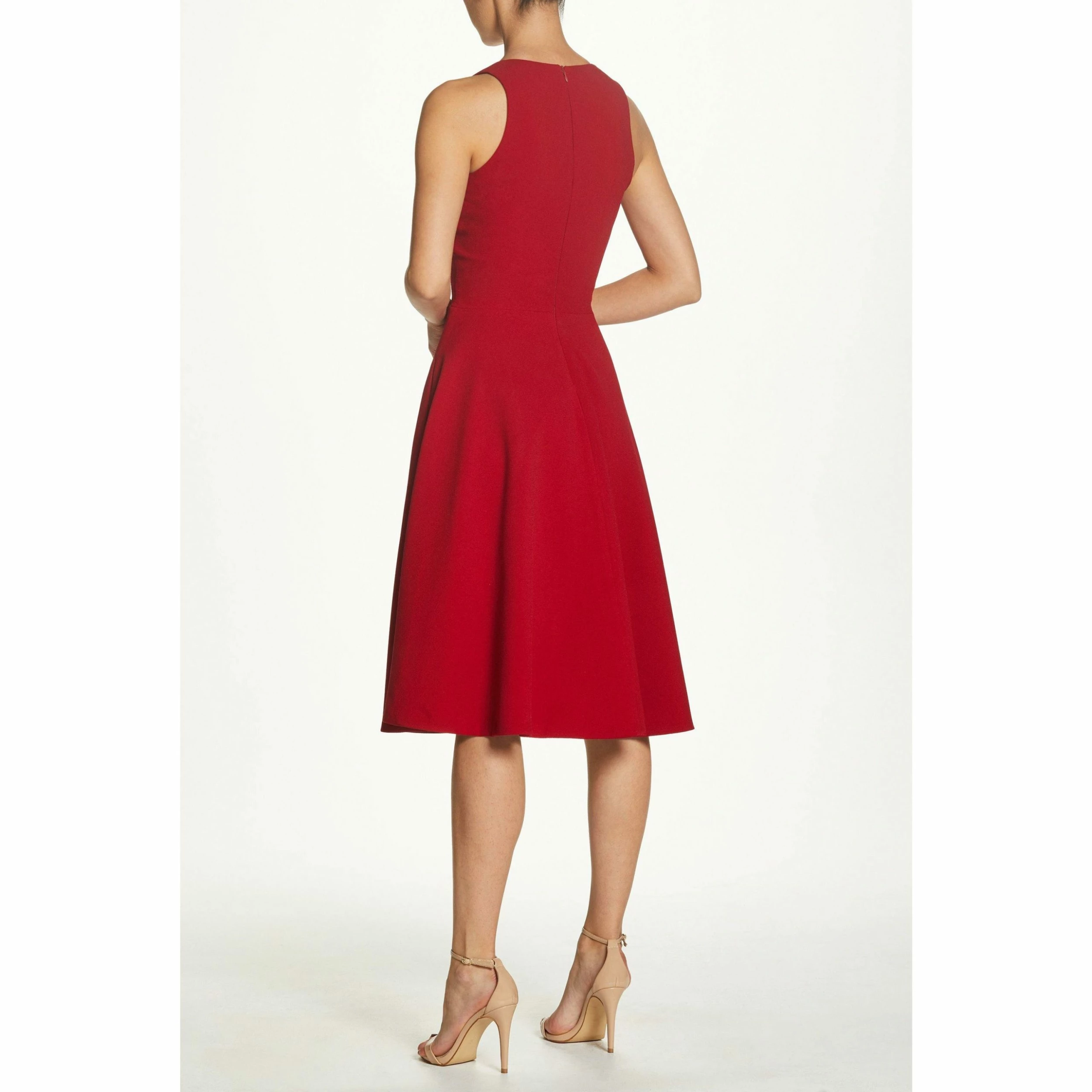The Catalina is a crepe cocktail dress with a fit and flare silhouette and a v-neckline that flatters all body shapes. The bodice is fitted and tapers in to hug the waist, and the knee-length skirt is playful but polished. This Garnet sleeveless dress has modest straps wide enough to cover the shoulders and two side pockets.