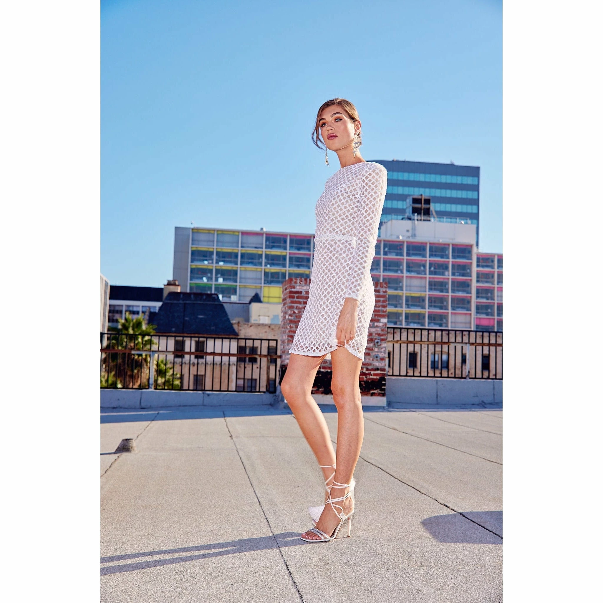 Bring the party wherever you go with this glitzy White sequin party dress. With an all-over crisscross pattern done in White sequins over the sheer White mesh, the nude lining underneath ensures the sequin’s design pops with as much sparkle as possible. This snug mini dress has long sleeves to balance the above-the-knee mini skirt.