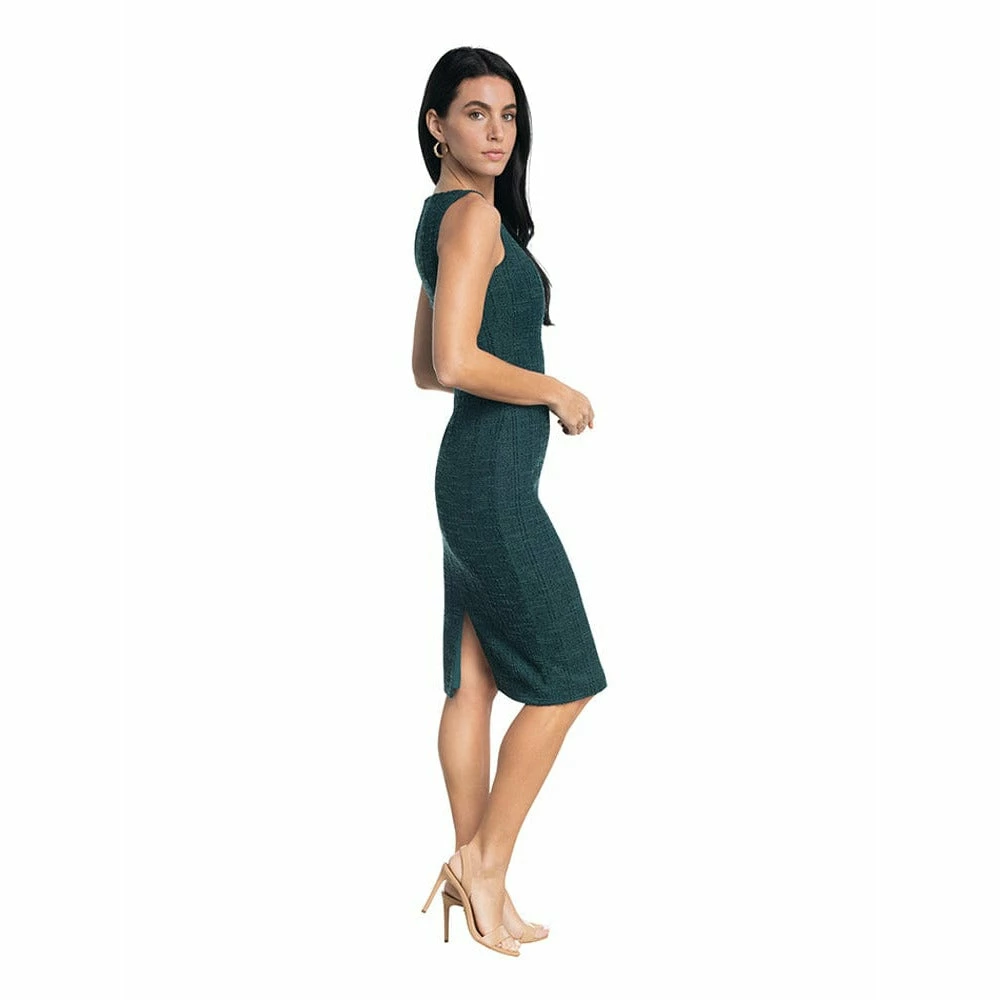 A Pine based tweed featuring glittering metallic fibers maintains the elegance of this svelte sleeveless sheath with a square neck that boasts a slim fit.