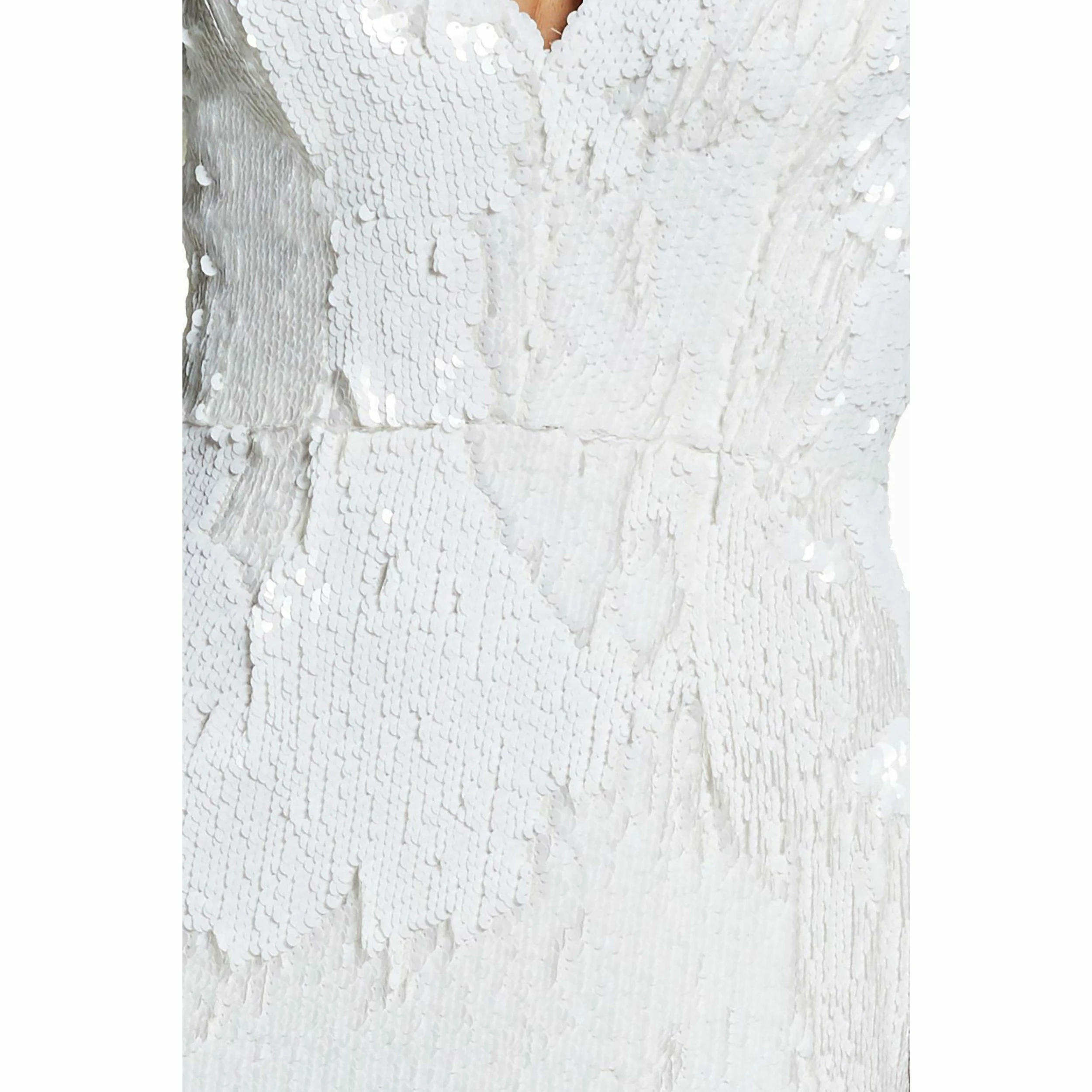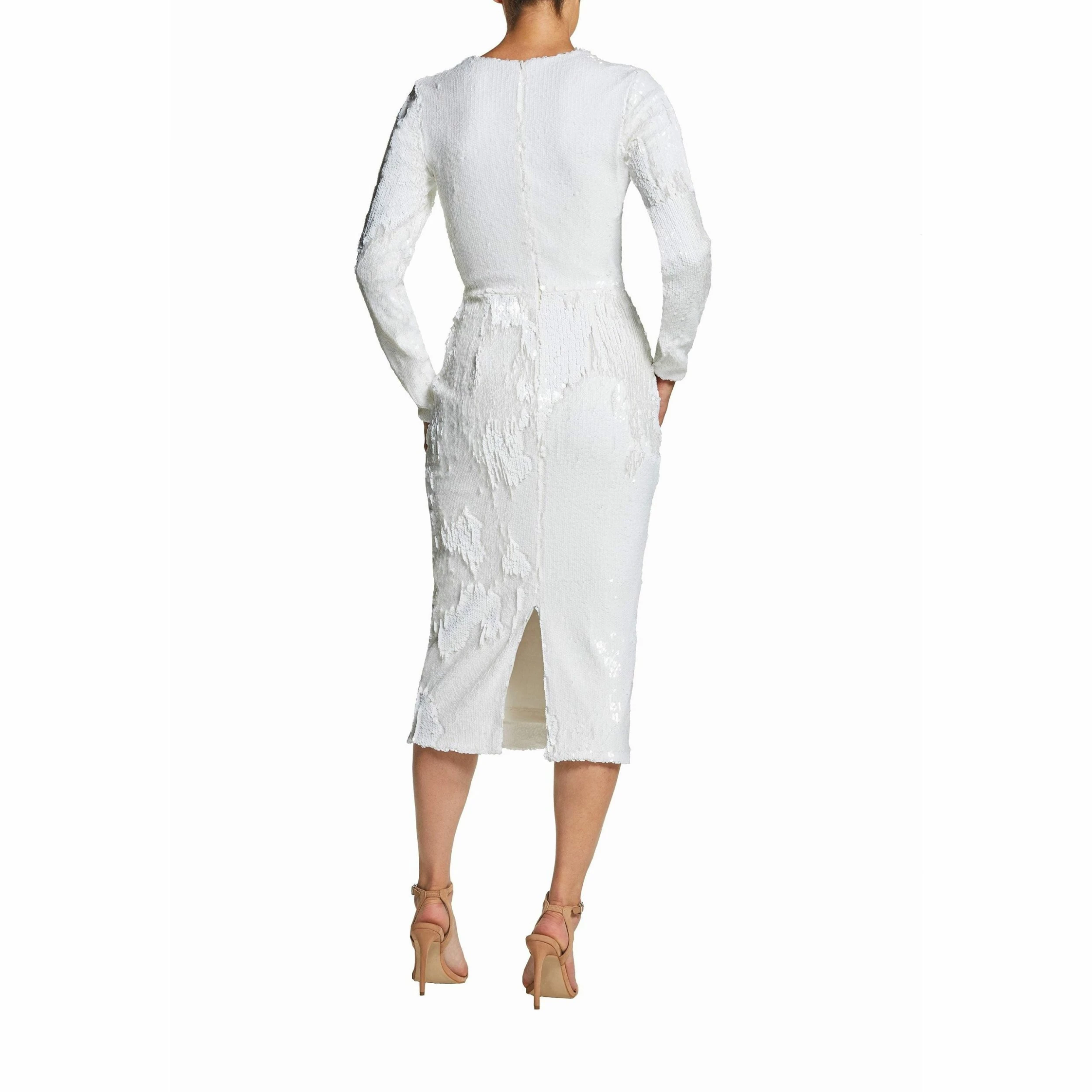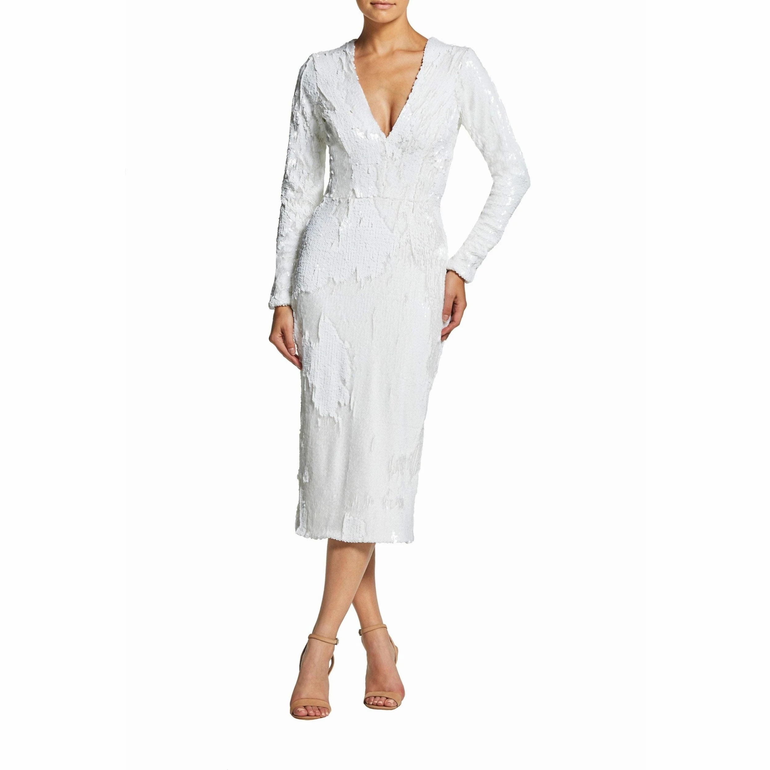 This sinuous midi dress is perfect for a night out. Icy shine bounces off the white sequins on stretch fabric that cover the Elizabeth, which features long sleeves, a plunging V-neckline, and a back slit for increased ease of movement.