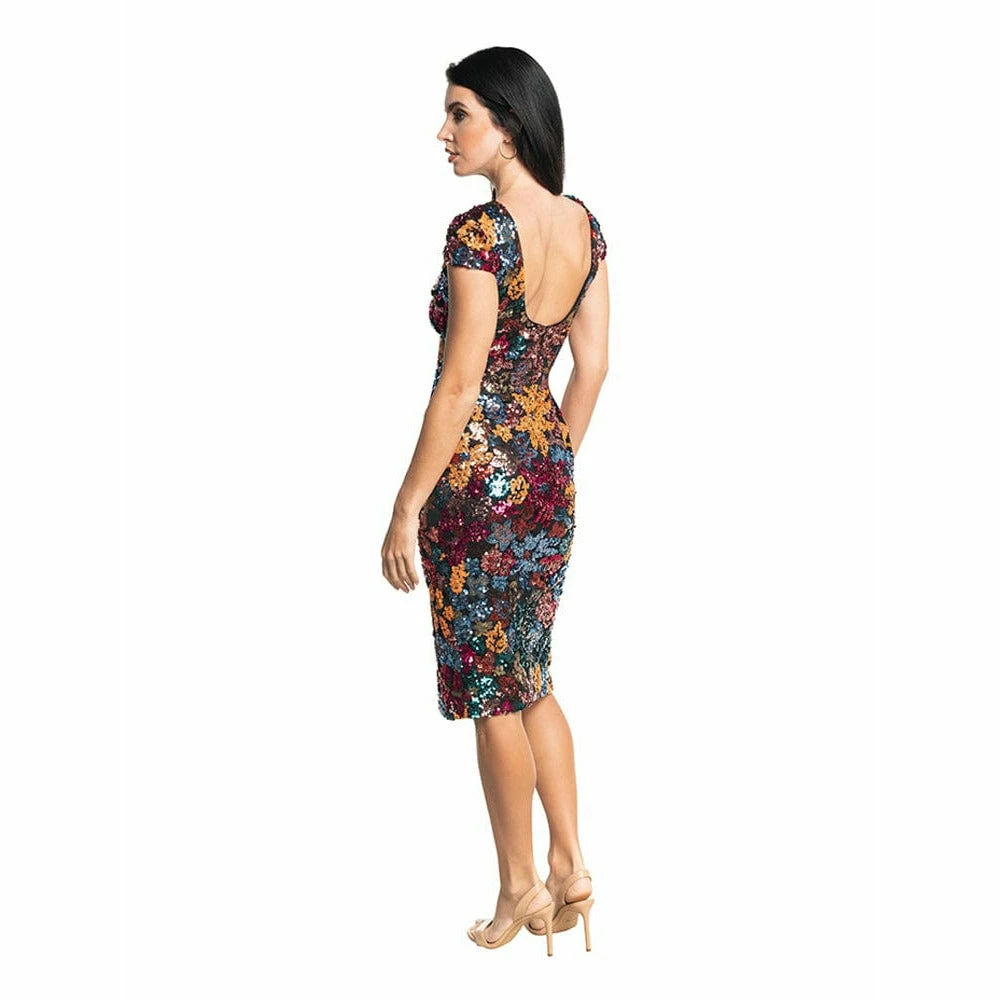 Multicolored sequins create a beautiful pattern on a figure-skimming sheath with a sultry thigh-high slit at the front.
