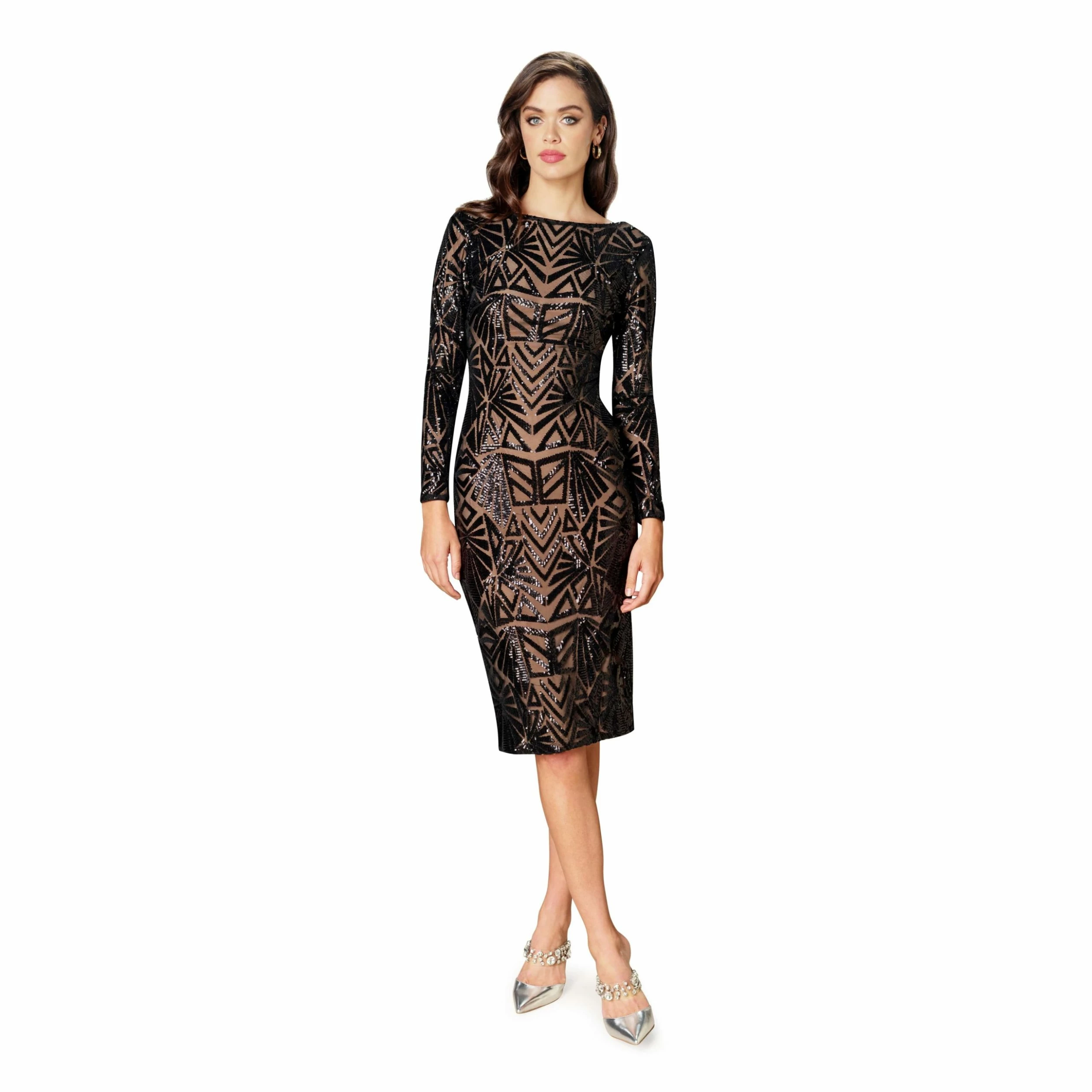 The Emery is an iconic Little Black Dress. The boatneck and midi length give you a sophisticated silhouette, while glitzy all-over sequins bring the glam factor. Additionally, metallic sequins add a modern twist to this classic style.