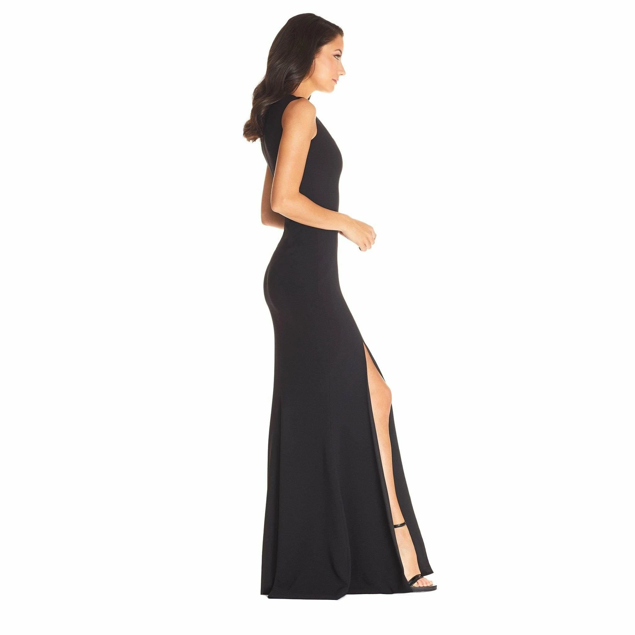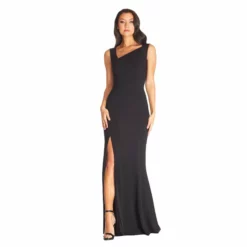 This stunning evening gown shaped by classic princess seams and a floor-sweeping skirt is elevated by an asymmetrical neckline. Complete with a zip-back closure, this sleeveless black dress is elegant and sophisticated.