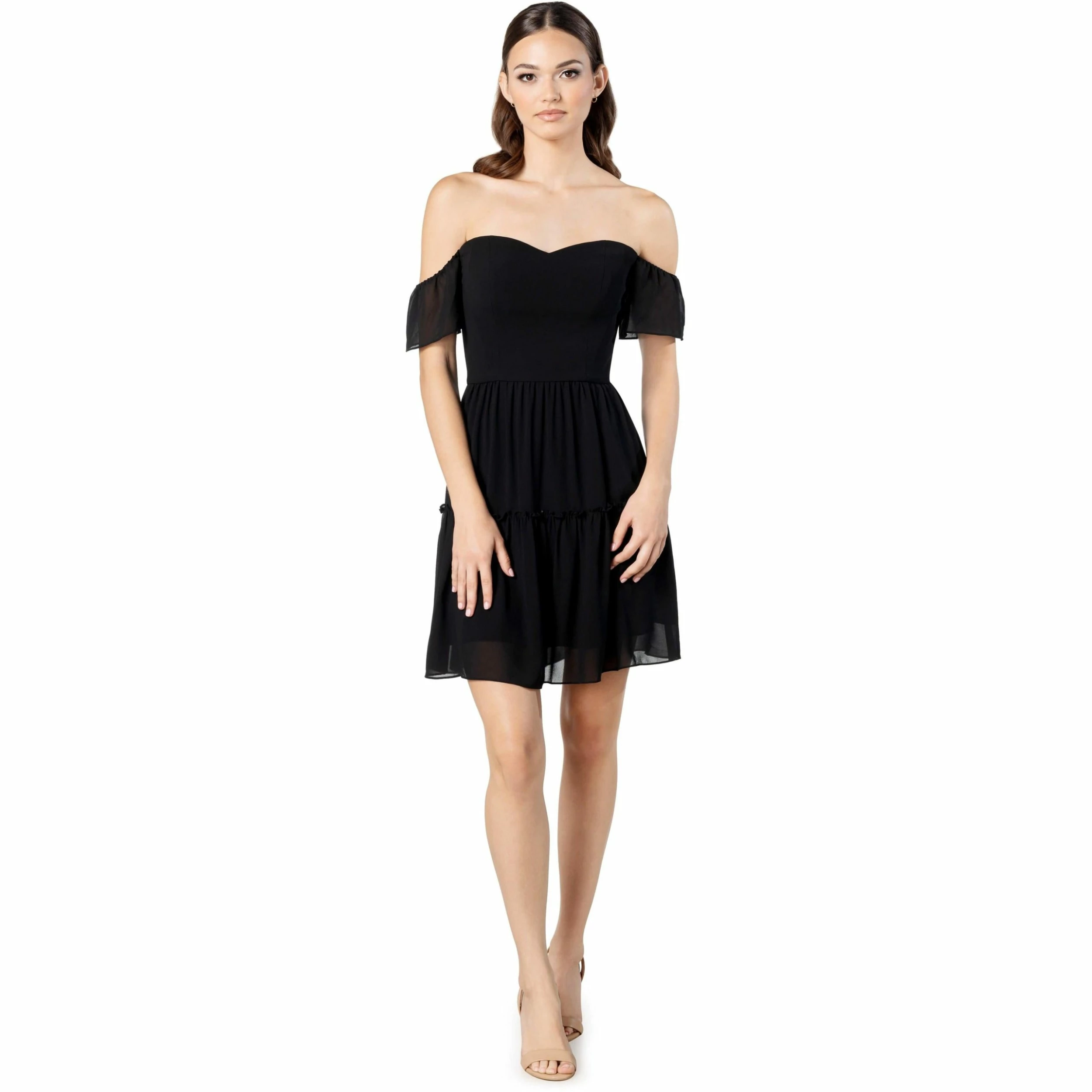 This off-the-shoulder dress features a tiered skirt and short sleeves. The sweetheart neckline and fitted bodice give this dress a romantic look.Â