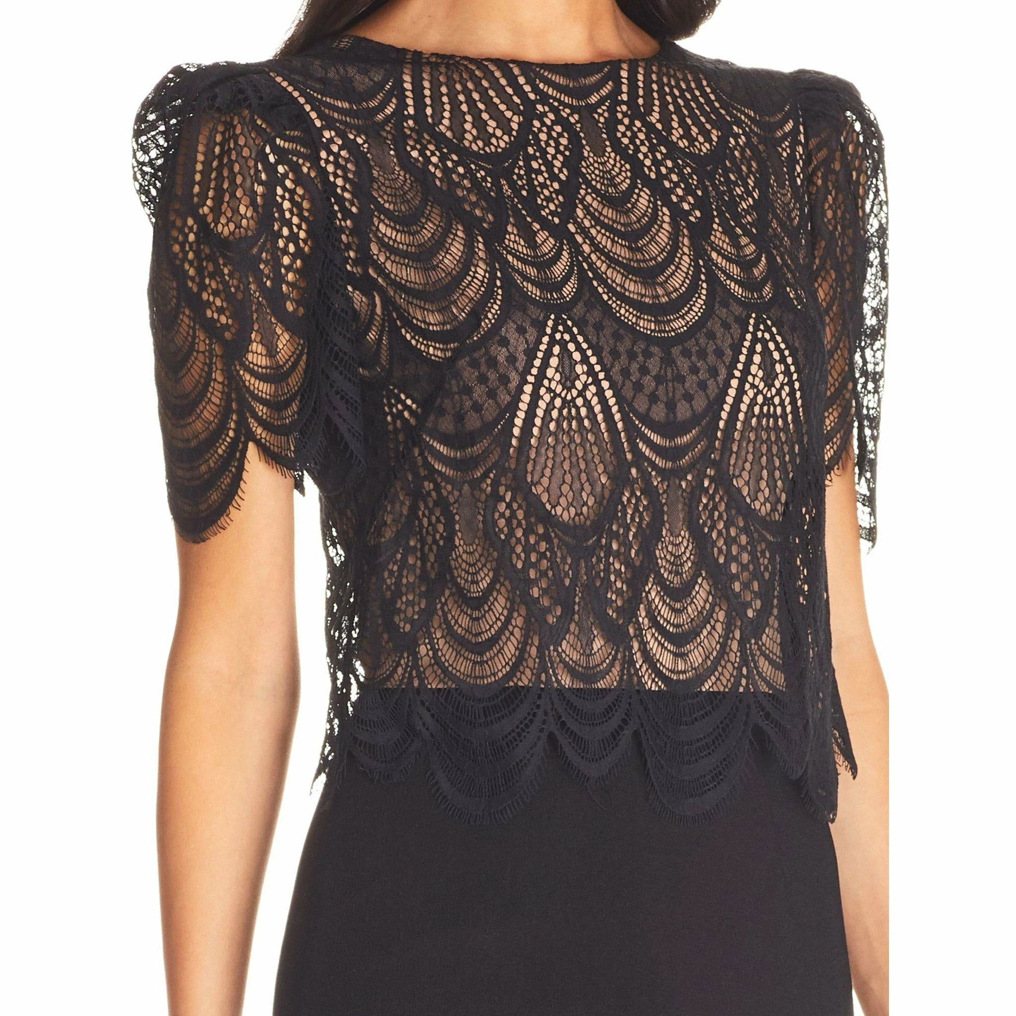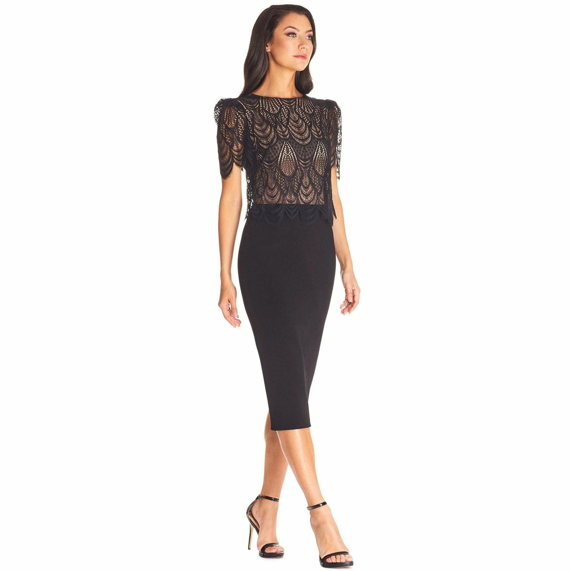 Kenna is modest with a touch of sexy. From a high neckline to short puff sleeves to a scalloped layered bodice, this stunning Black midi dress tells a story of elegance and sophistication. To complete the look, the skirt meets a high waist with a form-fitting pencil design and offers a small center slit detail.
