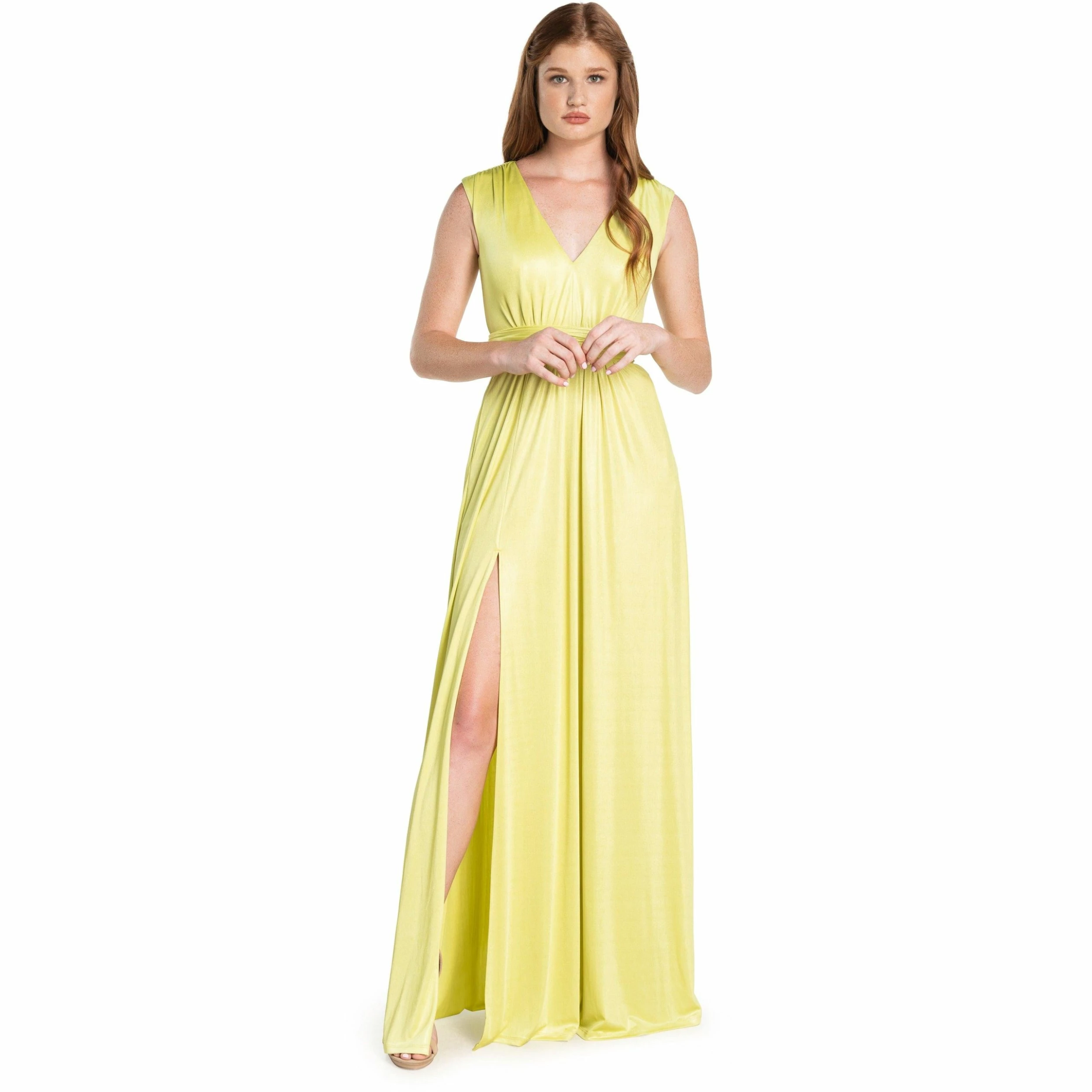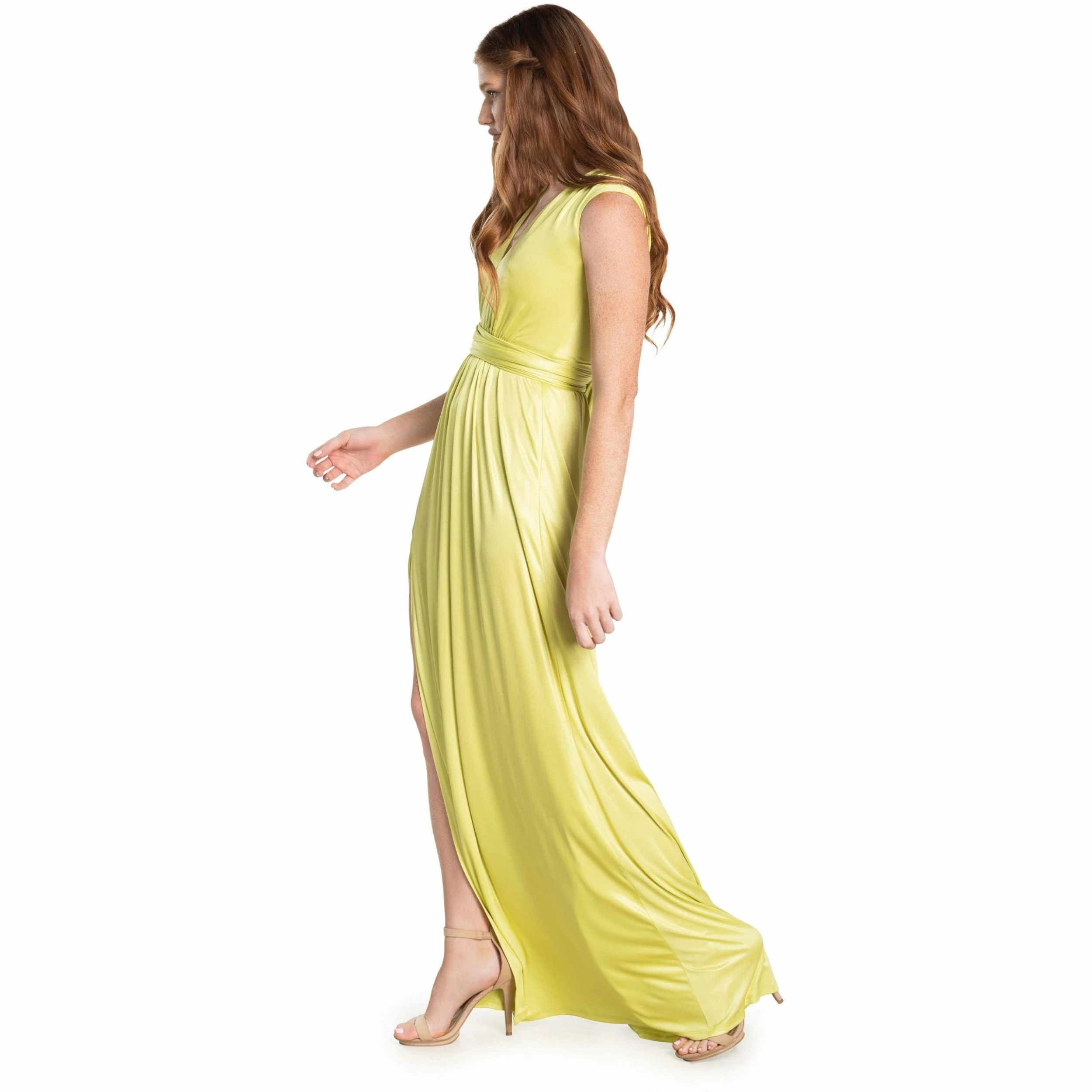 This floor-length gown flows over your curves and is a sophisticated choice for any occasion. The tie waist belt sets this ensemble apart, and the front slit adds a flirty touch. The V-neckline completes the look.Â
