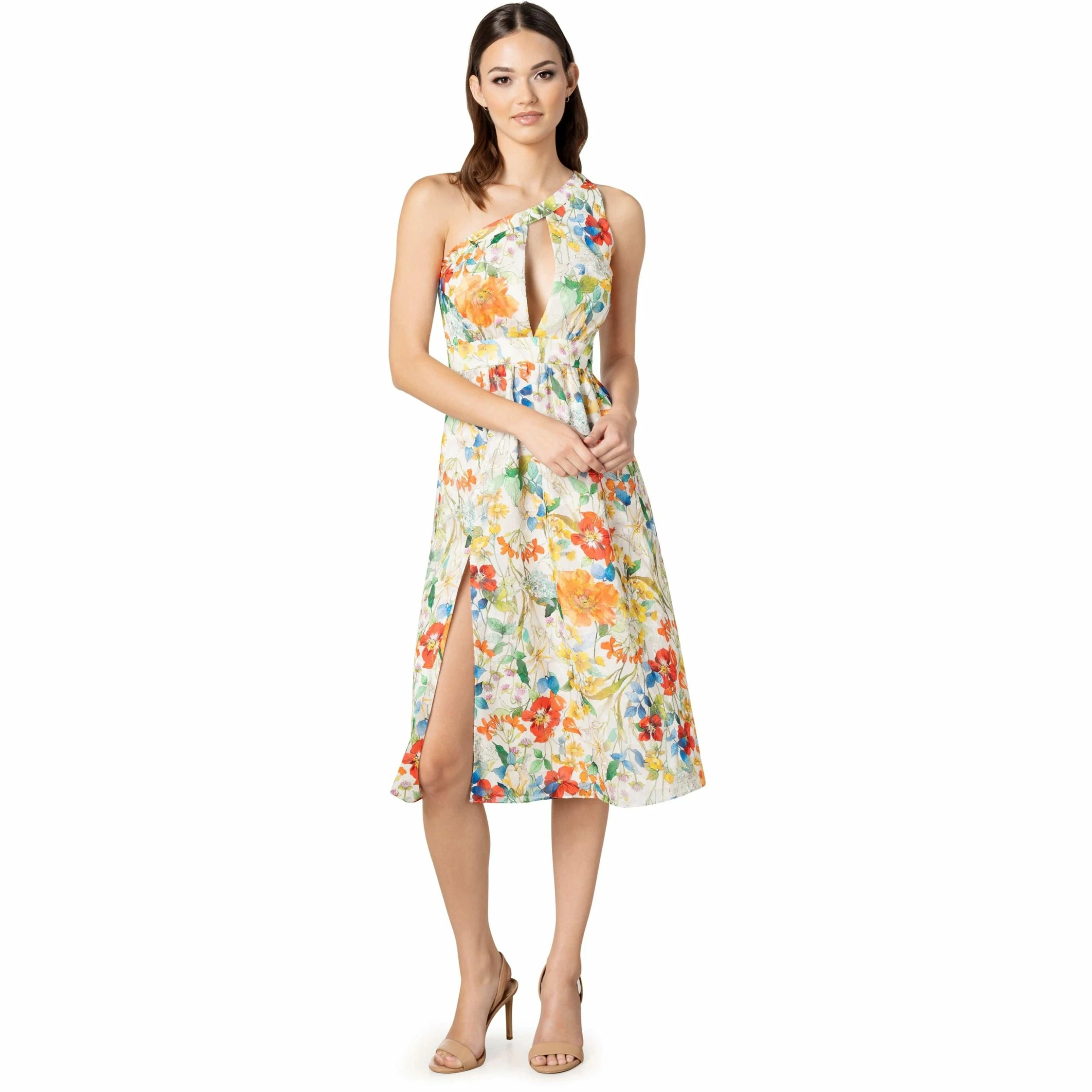 Delicate blooms and a daring neckline define this party-ready dress. This dress features an asymmetrical one-shoulder neckline with a cut out detail, midi length and front slit.