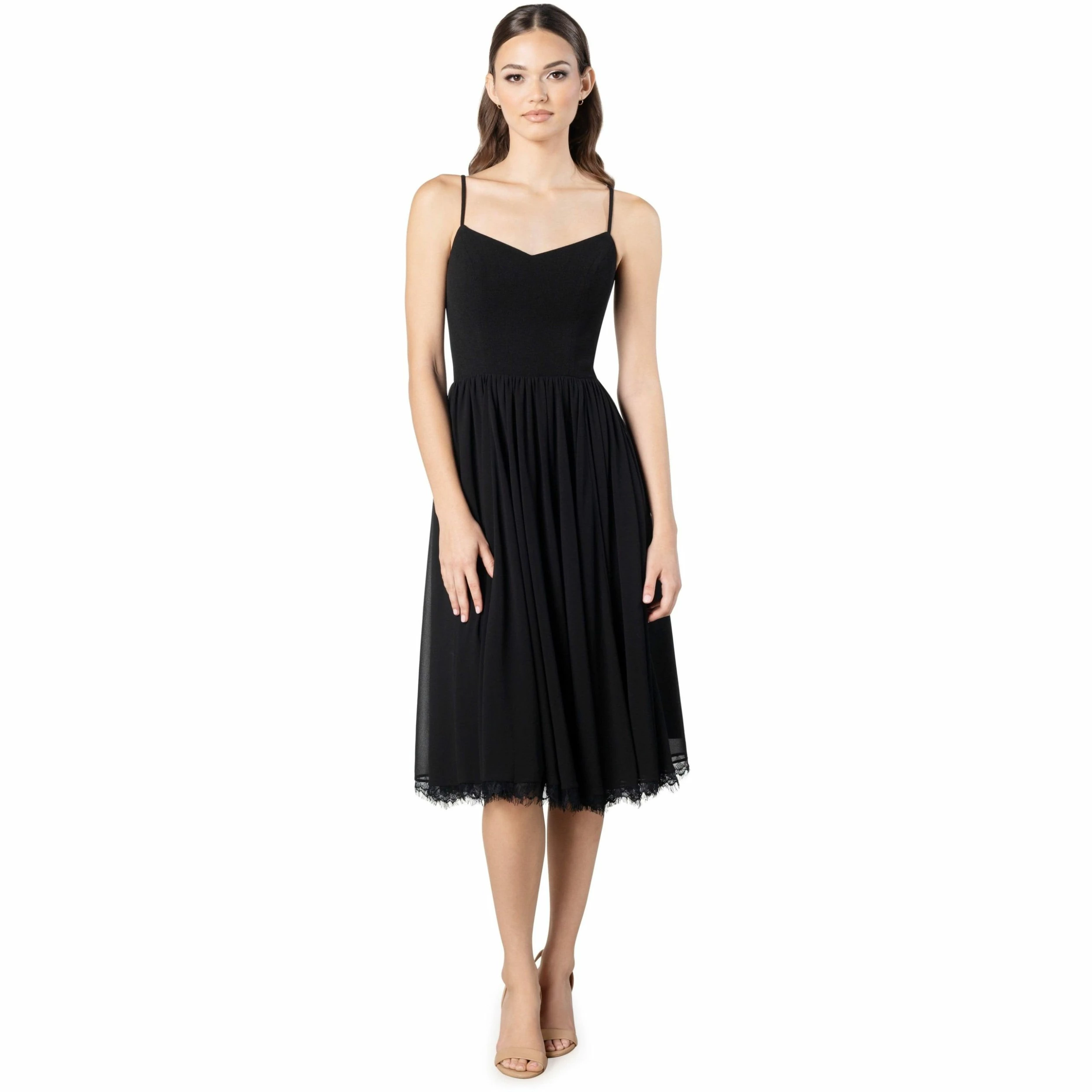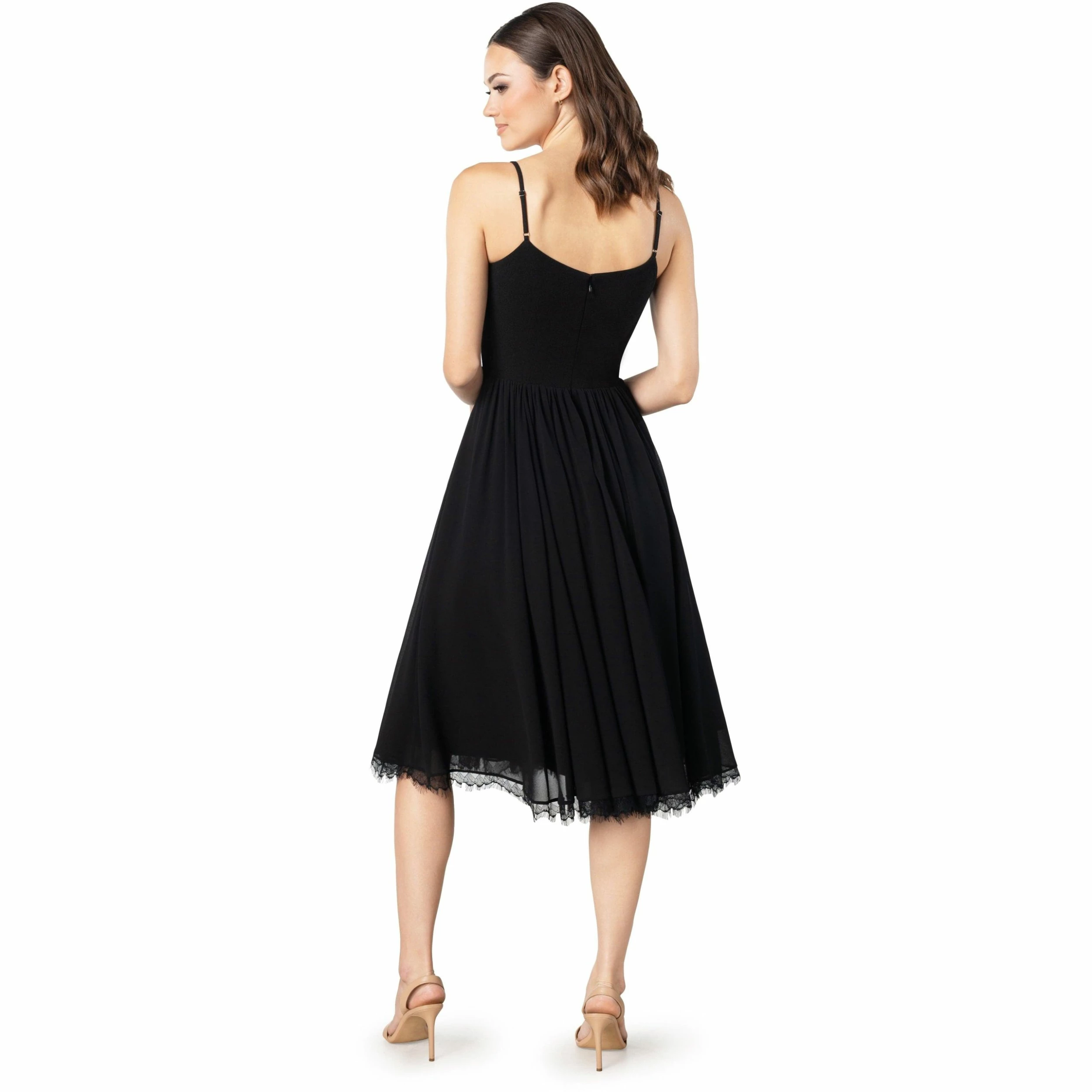 A fitted bodice transitions to a floaty chiffon skirt on this made-for-dancing dress featuring a lace-trimmed hem for contemporary elegance. Blocked sweetheart neckline fit and flare midi dress