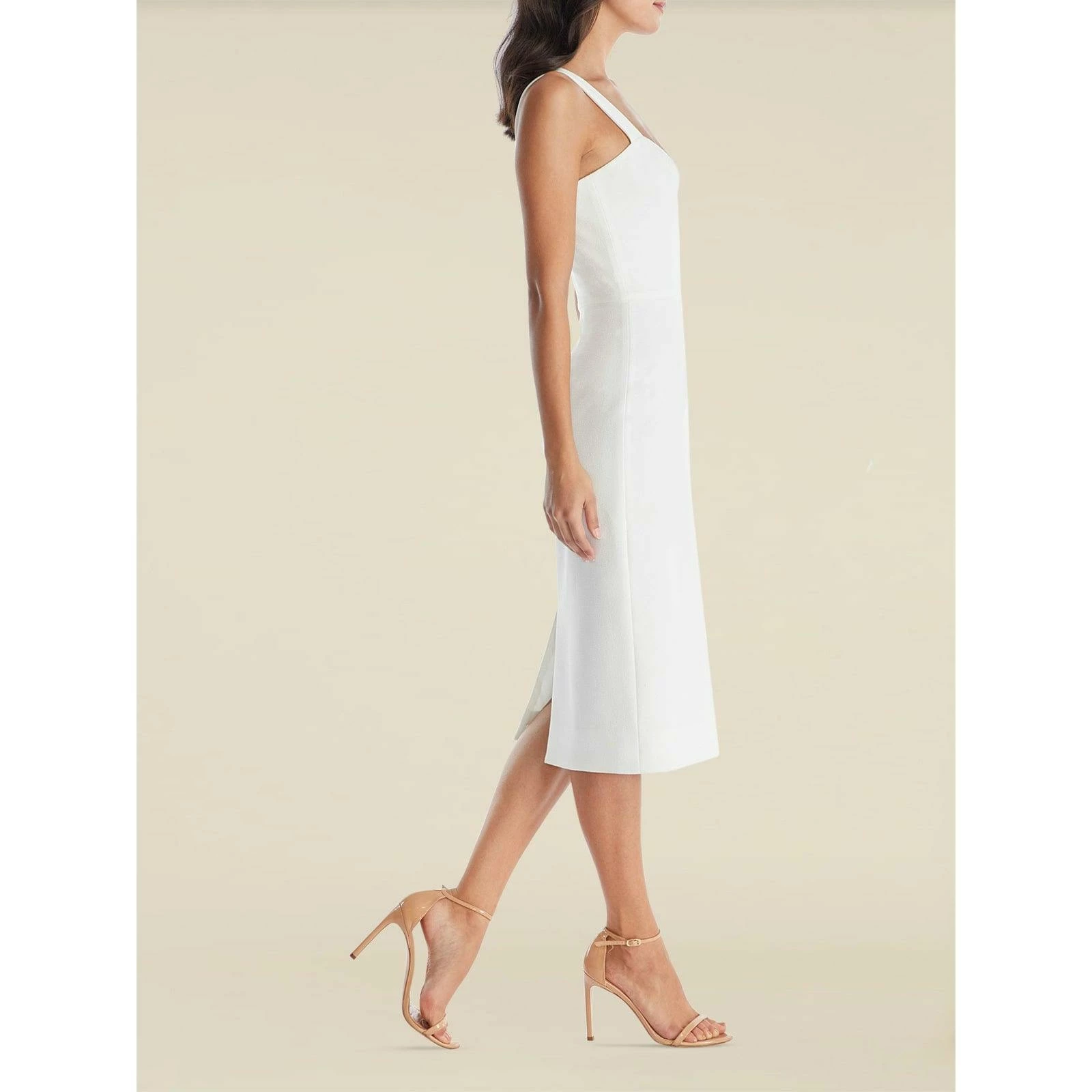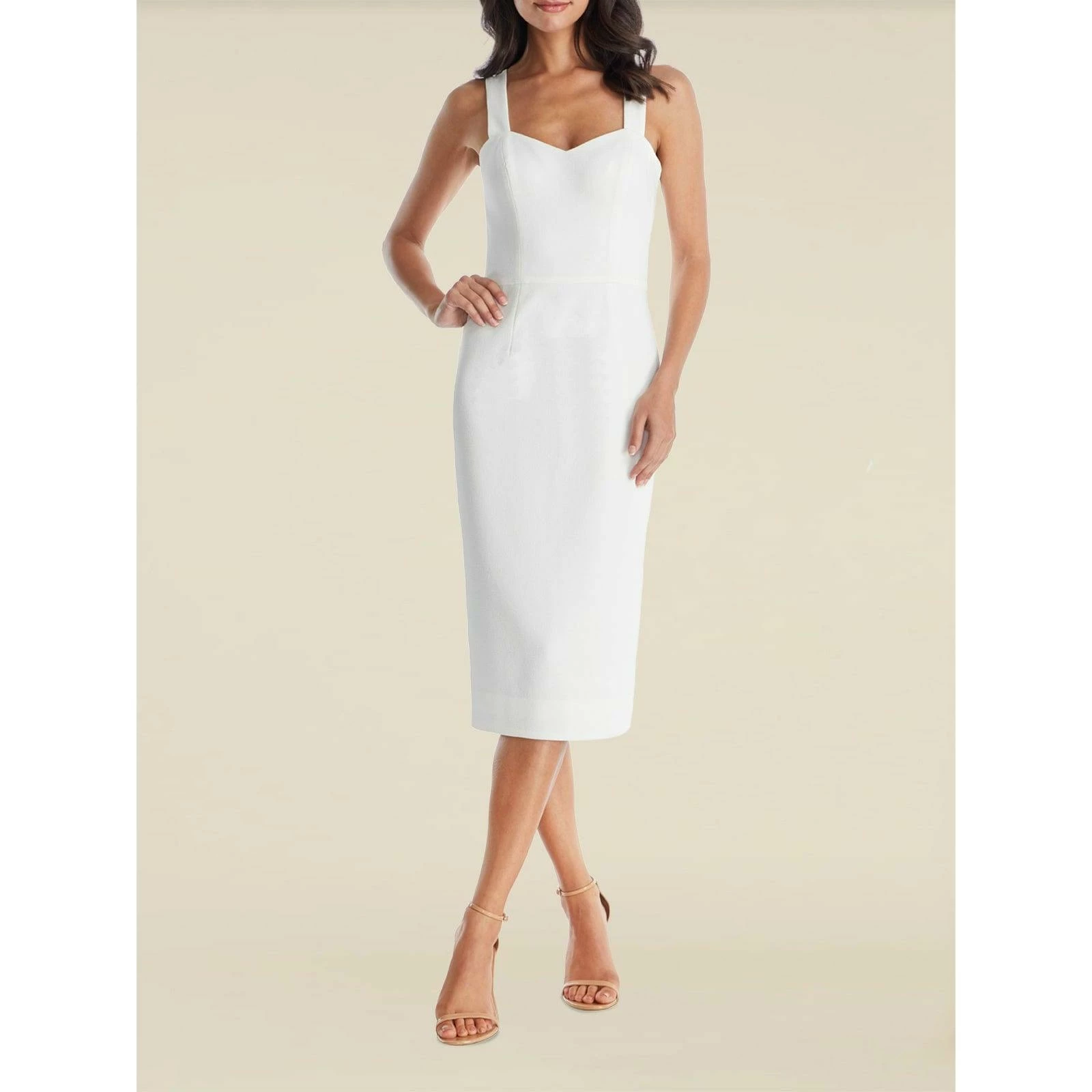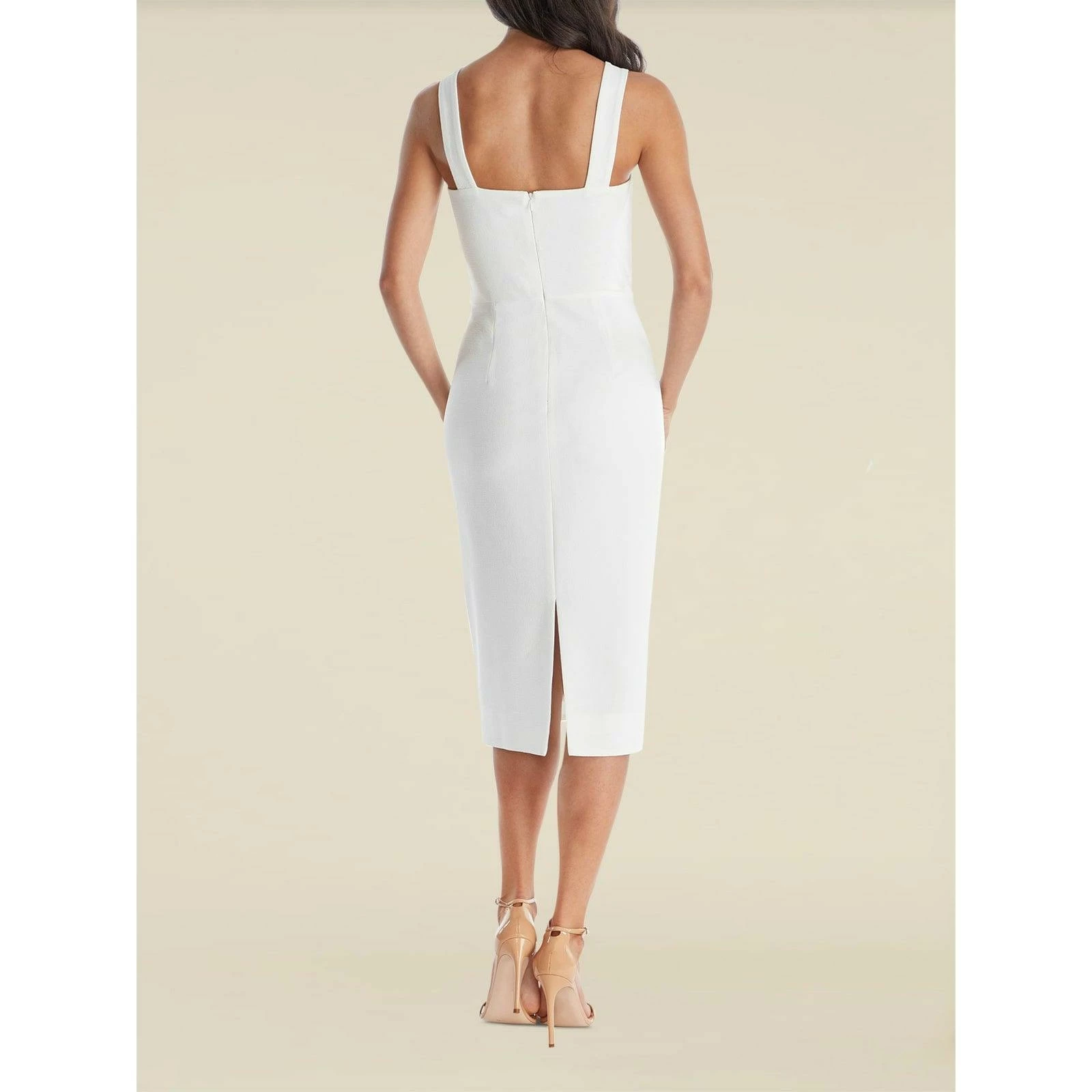 The Nicole sheath cocktail dress is sophisticated and stunning. This fitted sleeveless dress has a flattering silhouette that features a sweetheart neckline, square back, and a slit in the back of the cocktail-length skirt. Itβs made of off white crepe fabric.