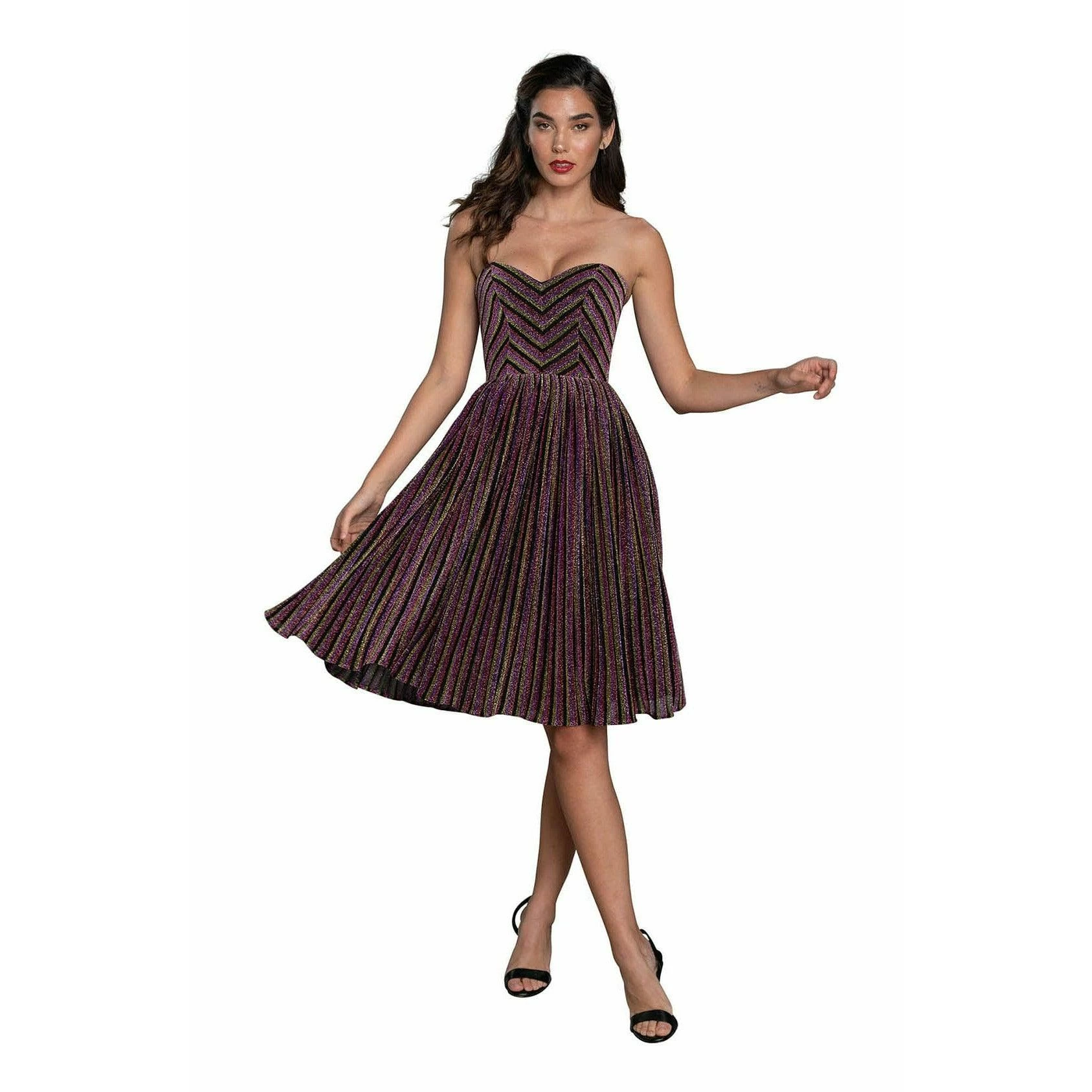 With a strapless sweetheart neckline and color chevron pattern, Rosalie is a fun choice for a night out. The form-fitting bodice accentuates your figure and leads to a pleated midi skirt. Metallic accents throughout add an eye-catching finishing touch.Â