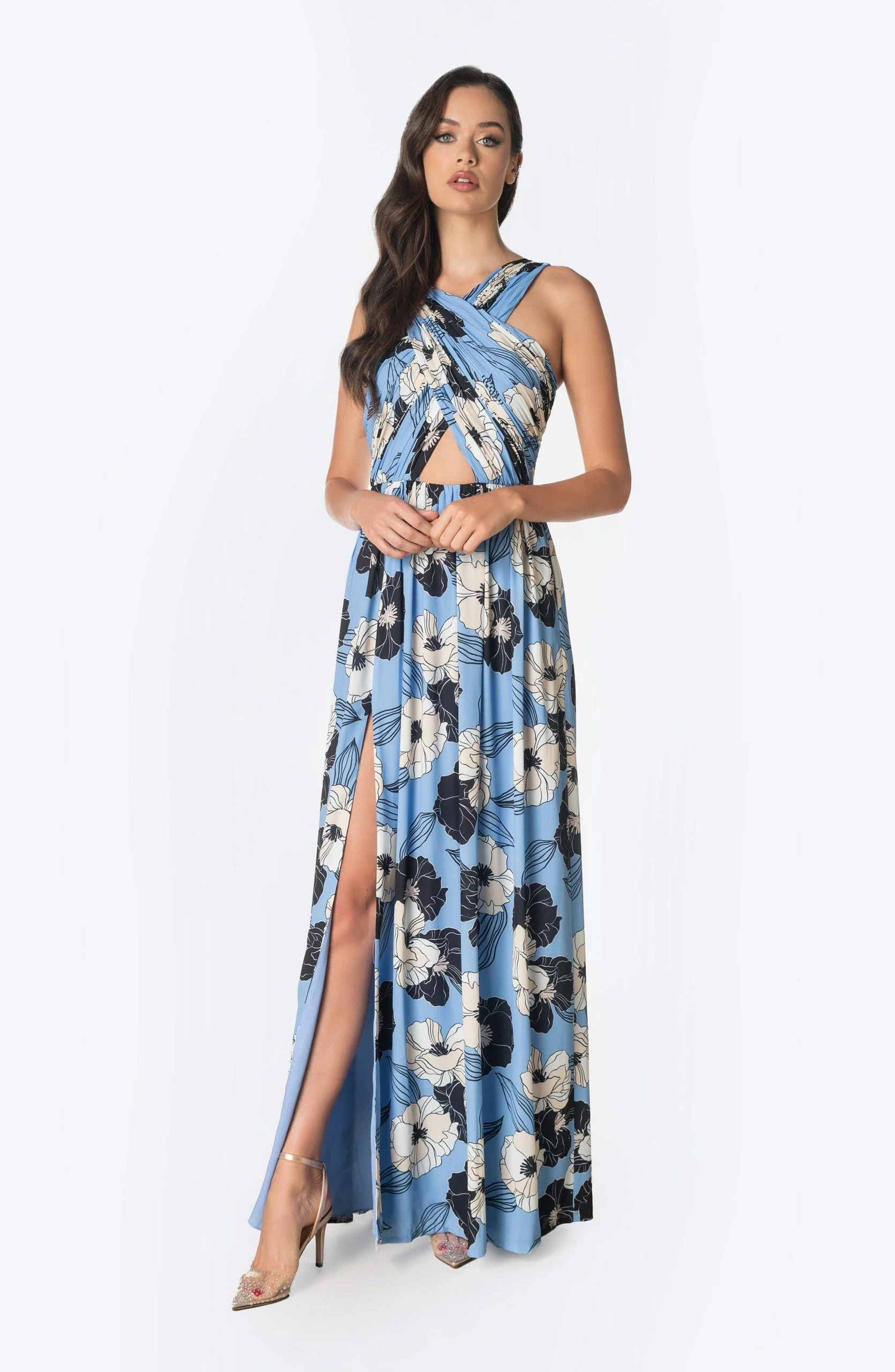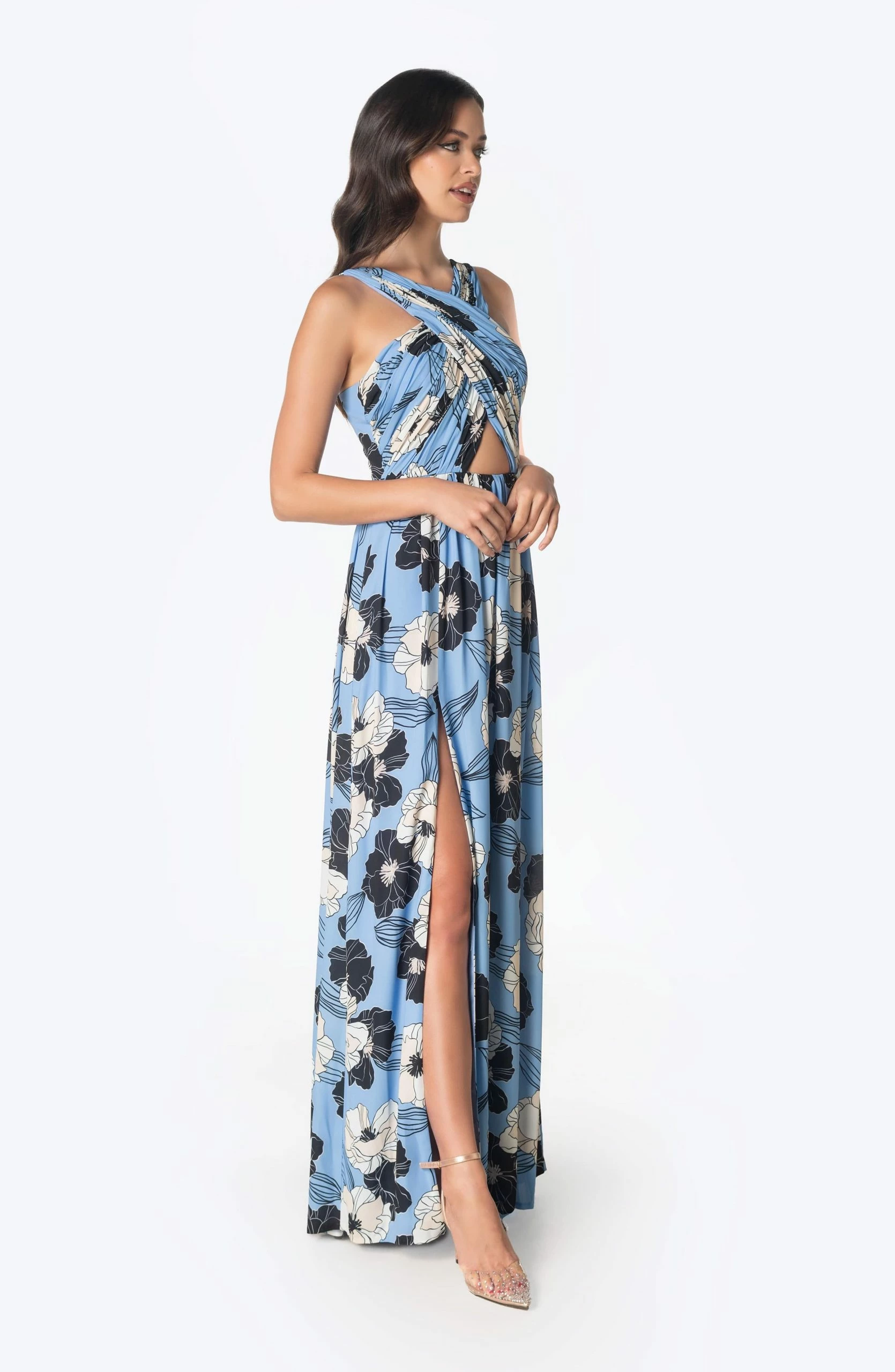 The Rose is a stunning gown that is perfect for day or night. Featuring a rouched cross front with cutout detail and high front slit. Made from a beautiful floral print georgette.
