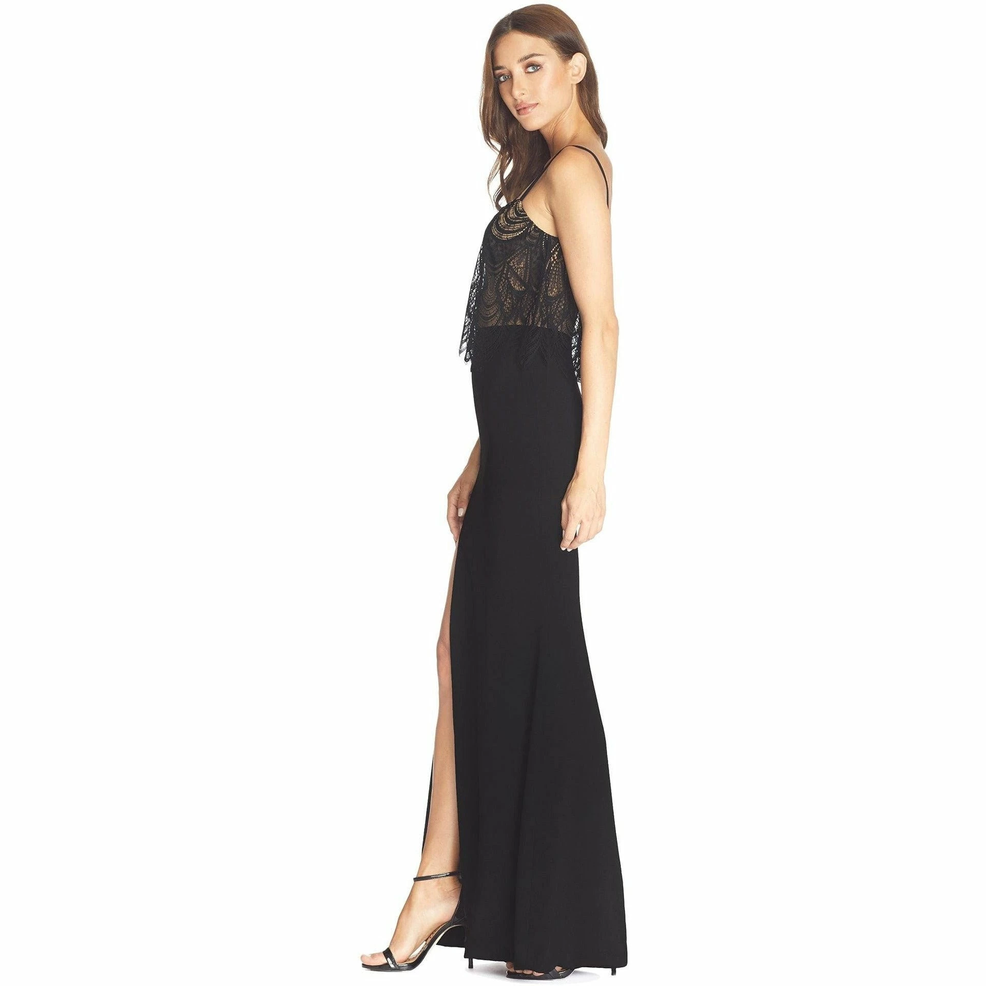 With this stunning black gown, you’ll command the room. Roselyn features adjustable spaghetti straps with a modest sweetheart neckline. The ruffle layered tank style bodice has stunning scalloped edges and a high waist, flattering your figure. The floor-length skirt has a dramatic side slit, allowing you to show a little leg.Â