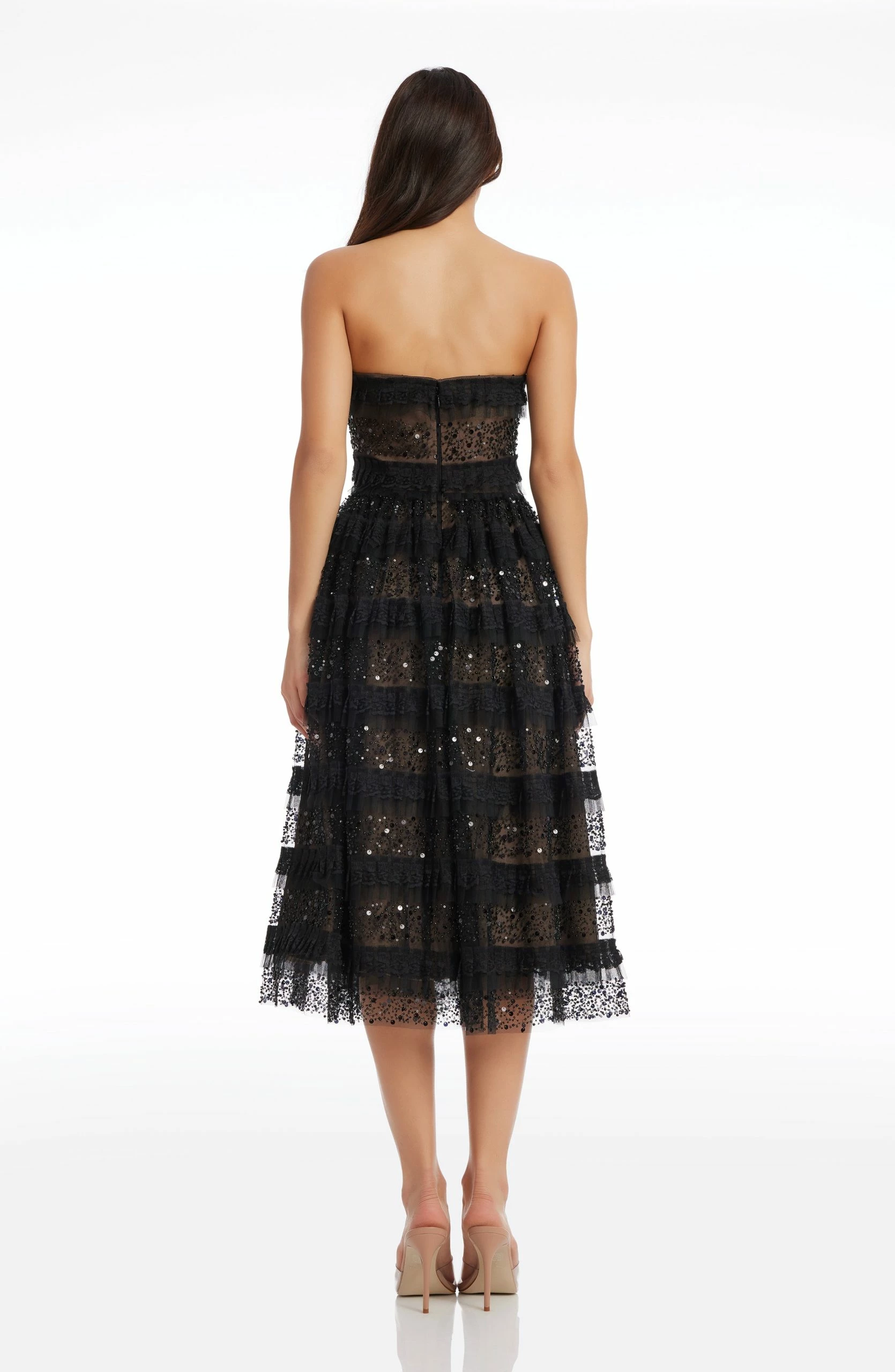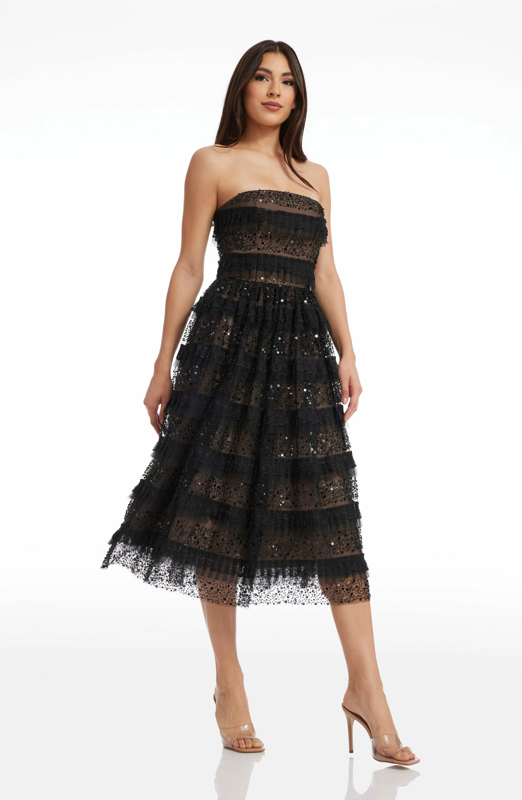 The Ruby Dress is a sophisticated and stylish choice for any special event. Featuring a strapless bustier fit and flare midi dress, it is the perfect combination of classic and modern. Dress it up in a pair of heels to make a stylish statement.