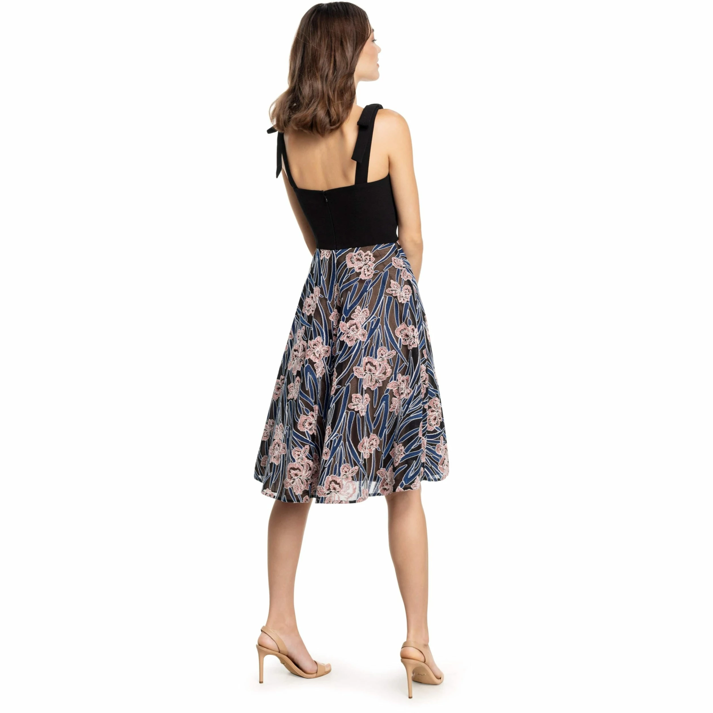 Sweeten the occasion in this tie-shoulder dress styled with a solid square-neck bodice and a flowery mesh skirt. Saige is the perfect dress to complement your special event.