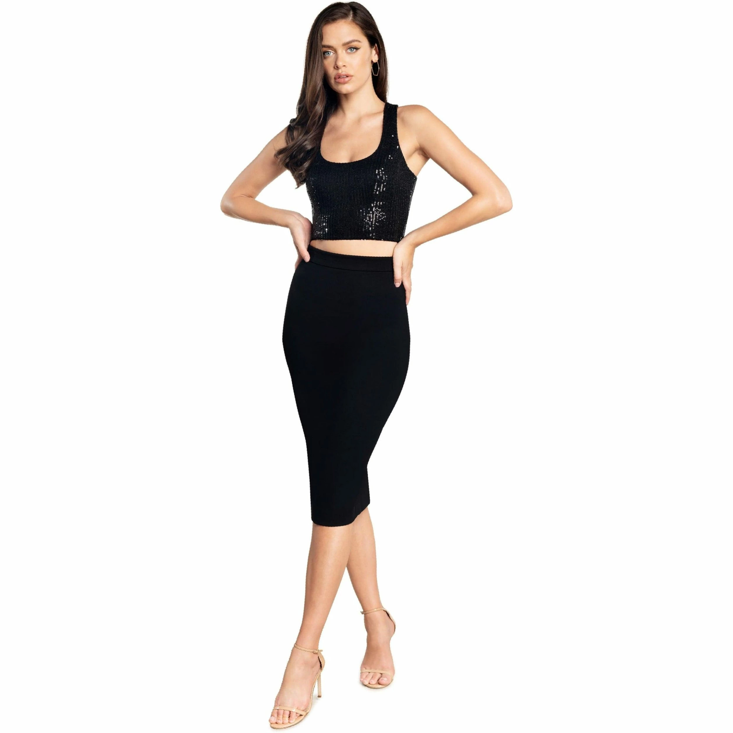 The Perfect pencil skirt has arrived. Made in our luxe ponte this skirt will hold you in and be comfortable to wear all day. Pair with your favorite T-shirt or our Zuri sequin top for a more dressed up look!