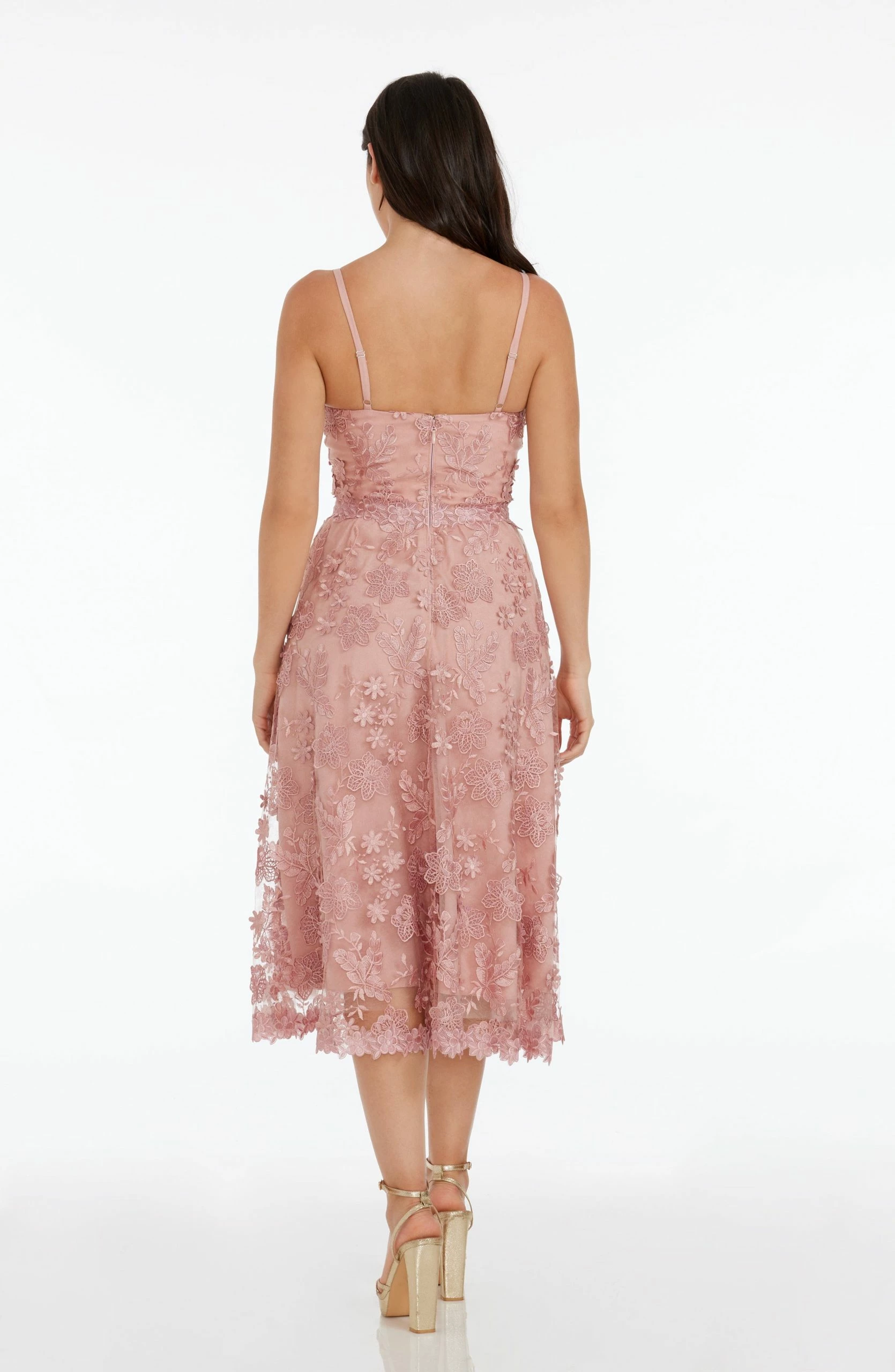 The Tahani Dress has an all-over floral embroidery design on non-stretch tulle, featuring a sweetheart neckline and adjustable straps. The hemline is finished with a floral trim, giving an extra feminine touch. This fit and flare style dress is perfect for a warm summer night or even a special occasion.