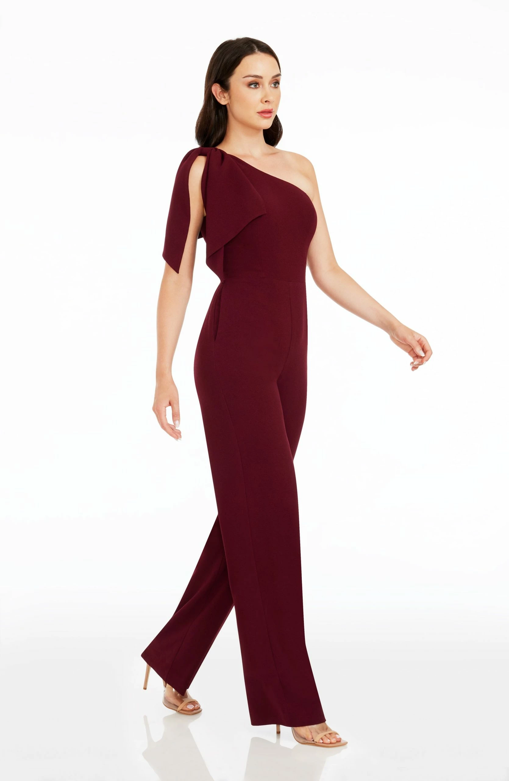 The Tiffany jumpsuit is classy with a touch of flair thanks to the asymmetrical one-shoulder neckline. The top portion hugs your figure while the wide legs create a flattering finish. The burgundy color looks great on any body type and the jumpsuit also has pockets.