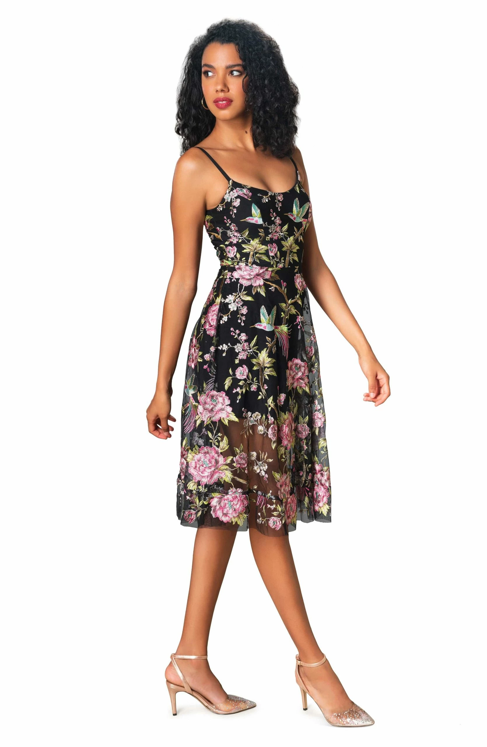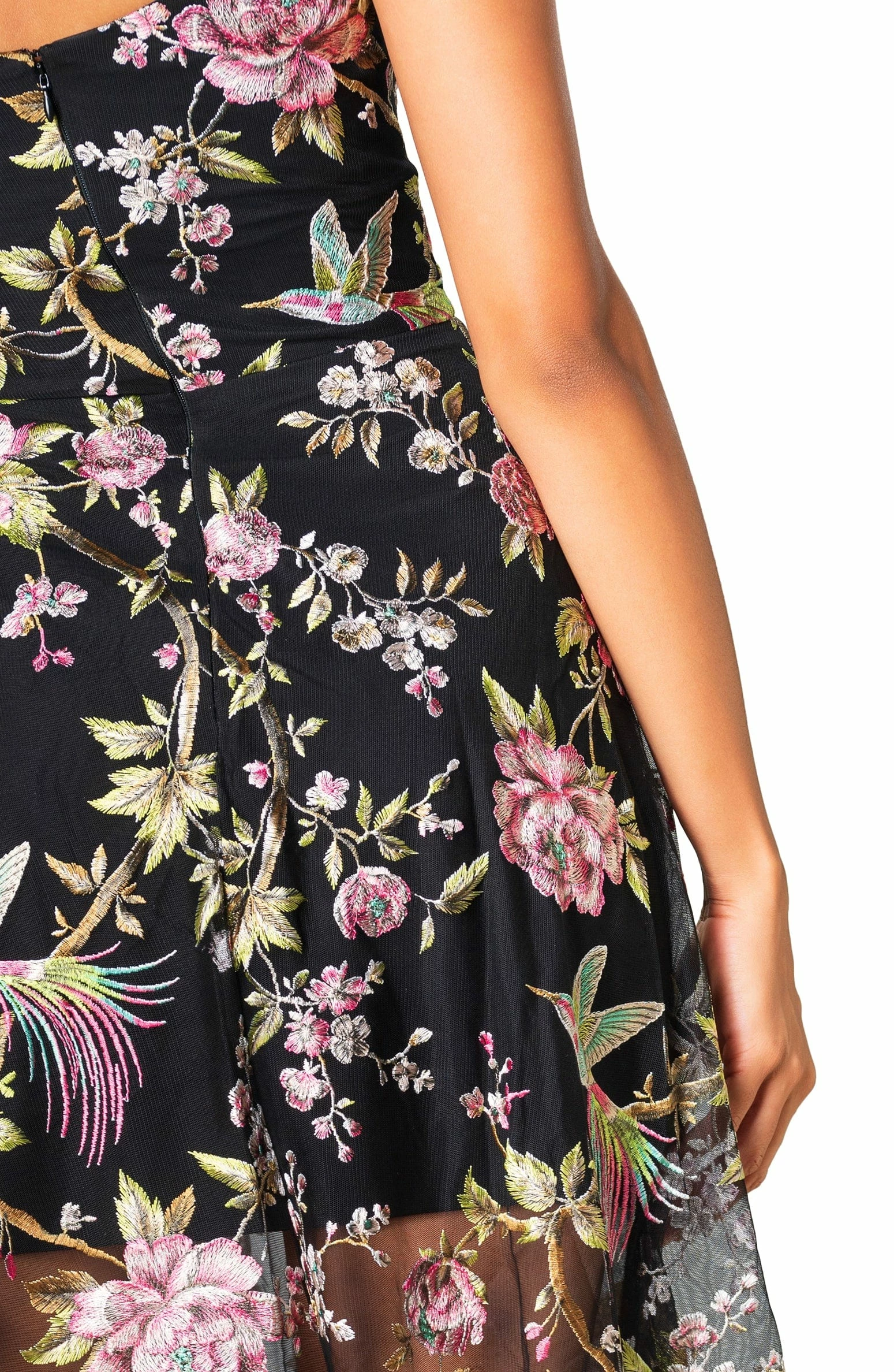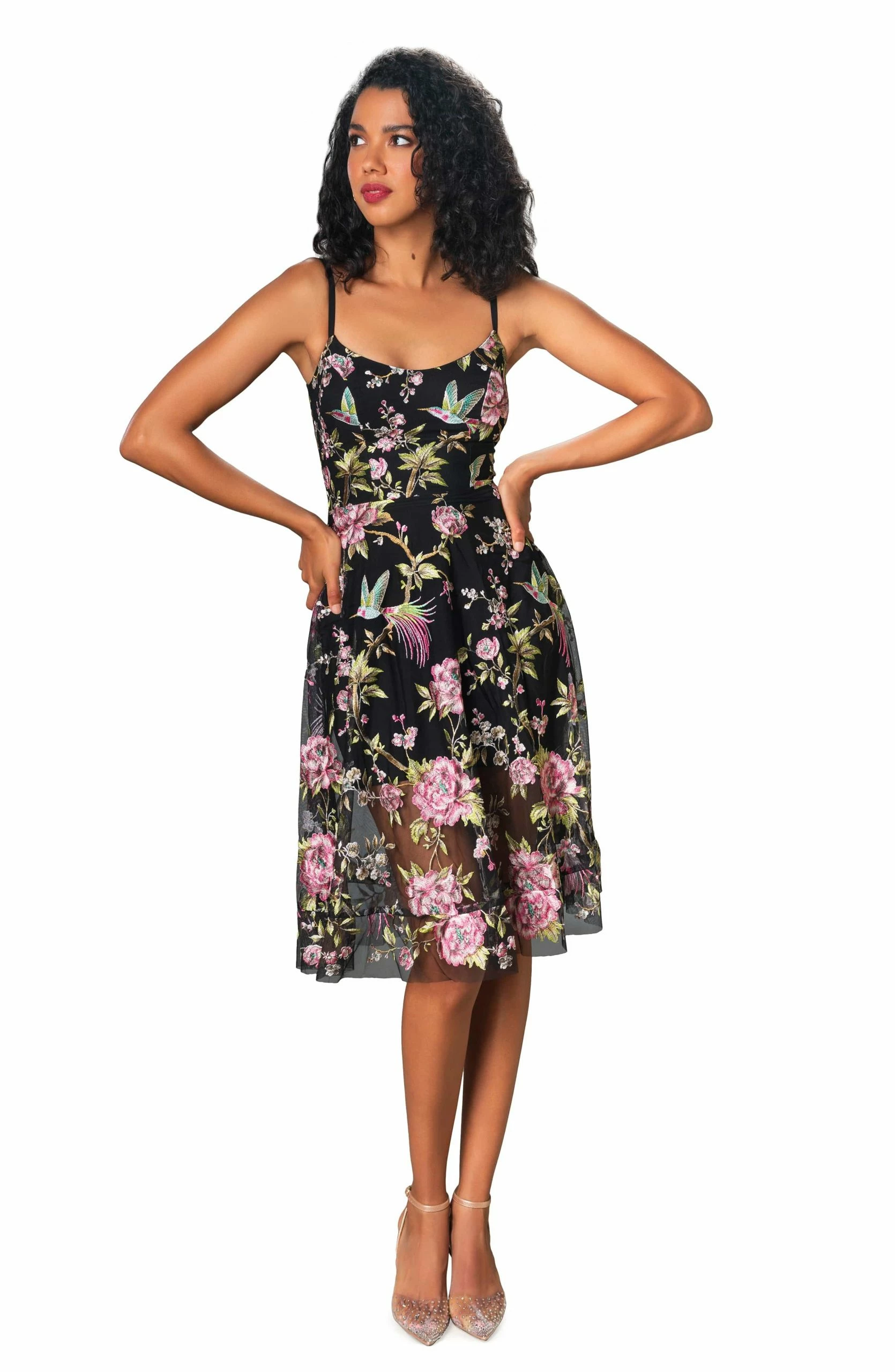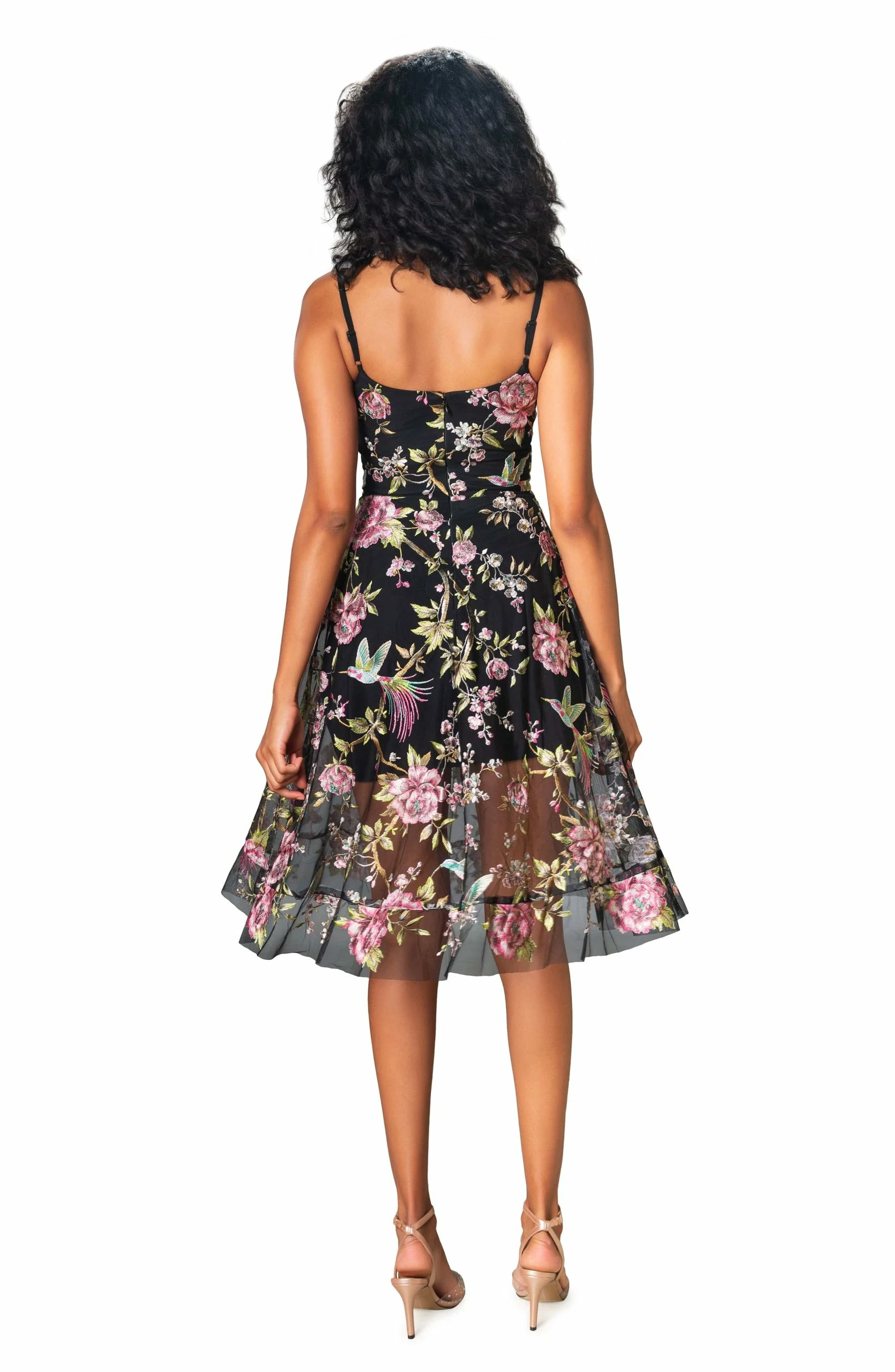 Featuring a floral embroidery overlay that lands just below the knee, this fun and flirty fit and flare dress is sure to impress. The Uma also shows off your legs with a sultry mini-skirt. This dress stretches minimally, is partially lined, and has a center-back zipper.Â